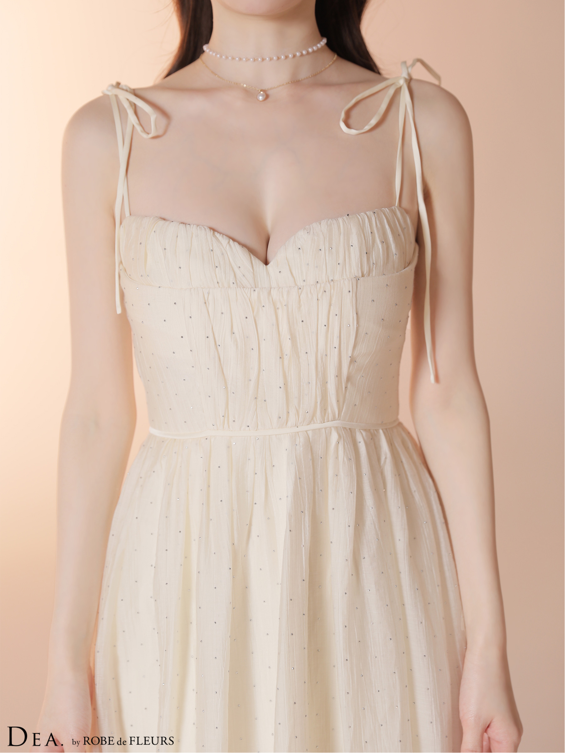 細めのキャミソールストラップとハートカットのバストラインが、女性らしい華奢な印象に。