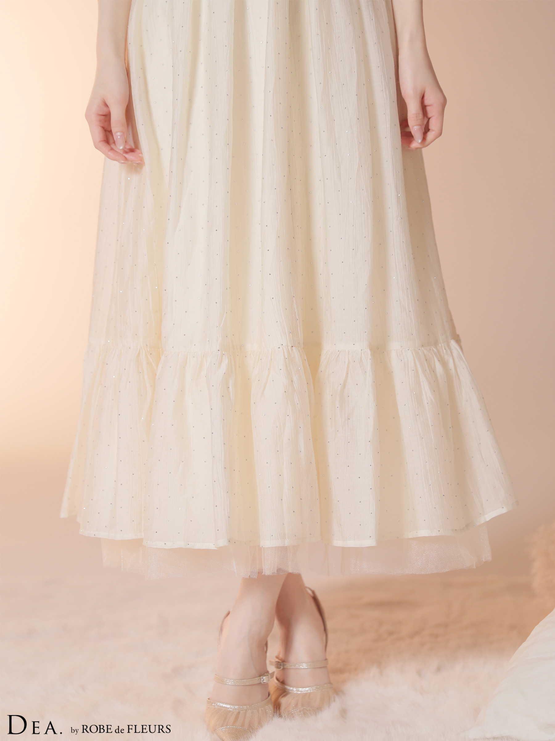 ランダムに散りばめられたストーンが動くたびにキラキラ輝きを放つ、華やかなロングドレス。