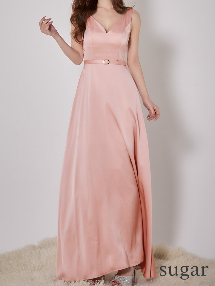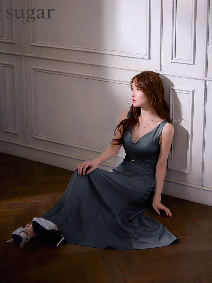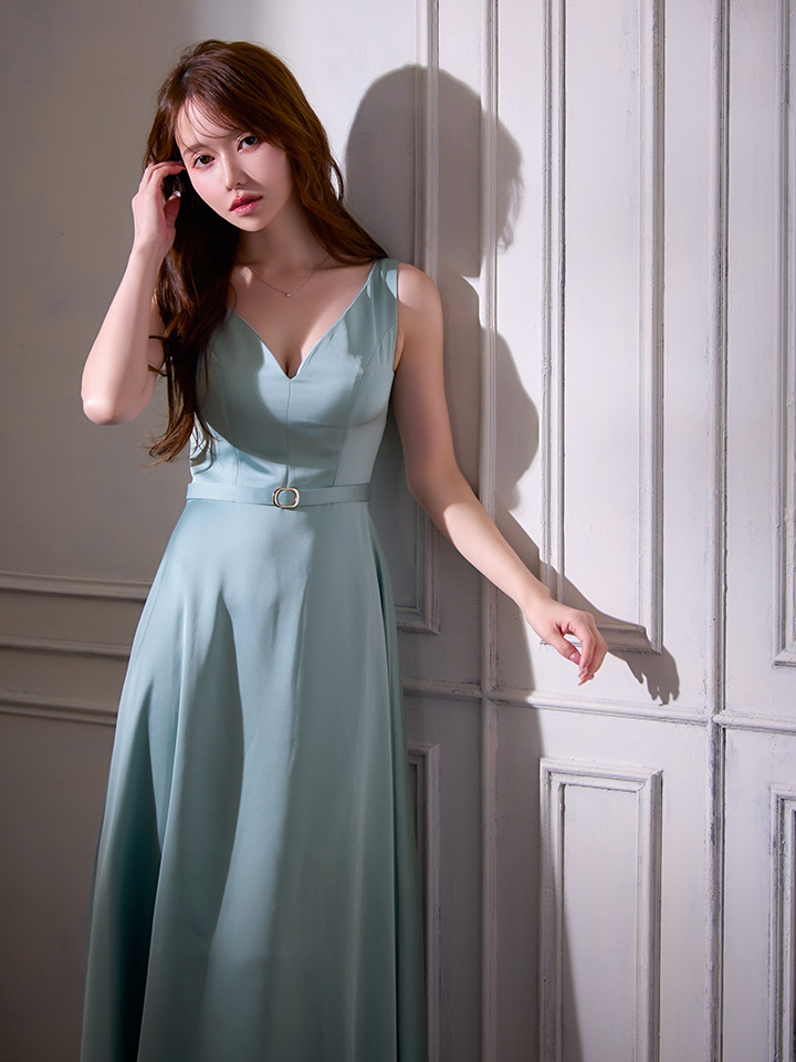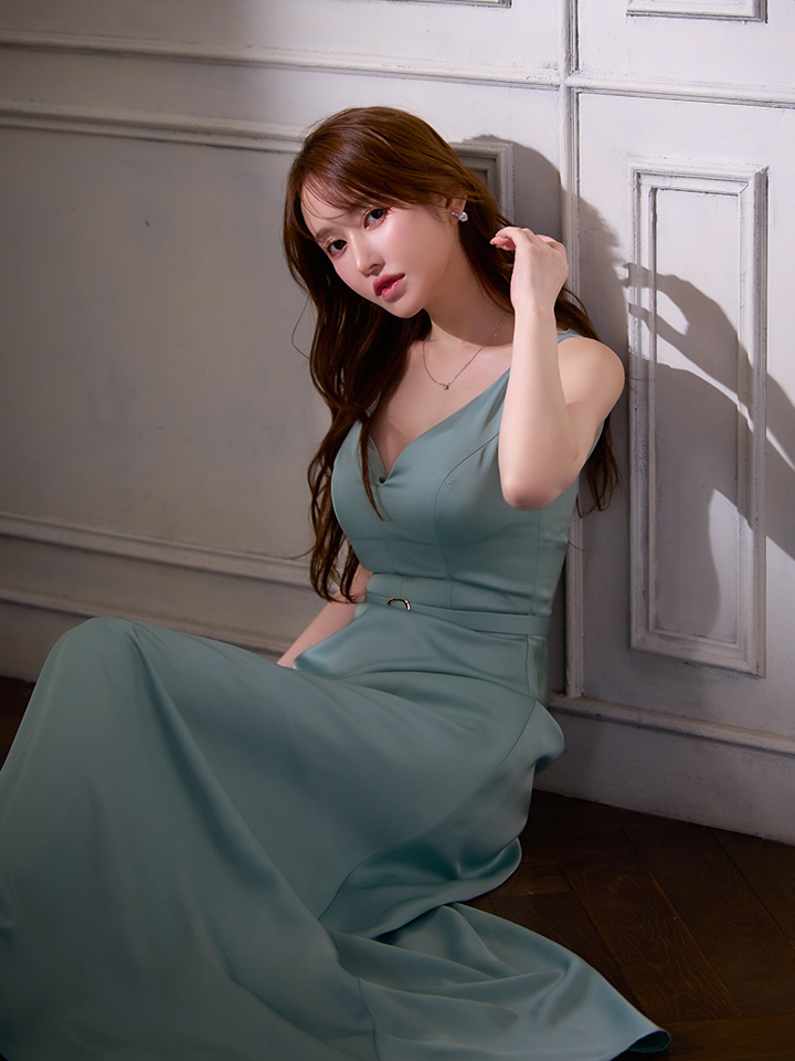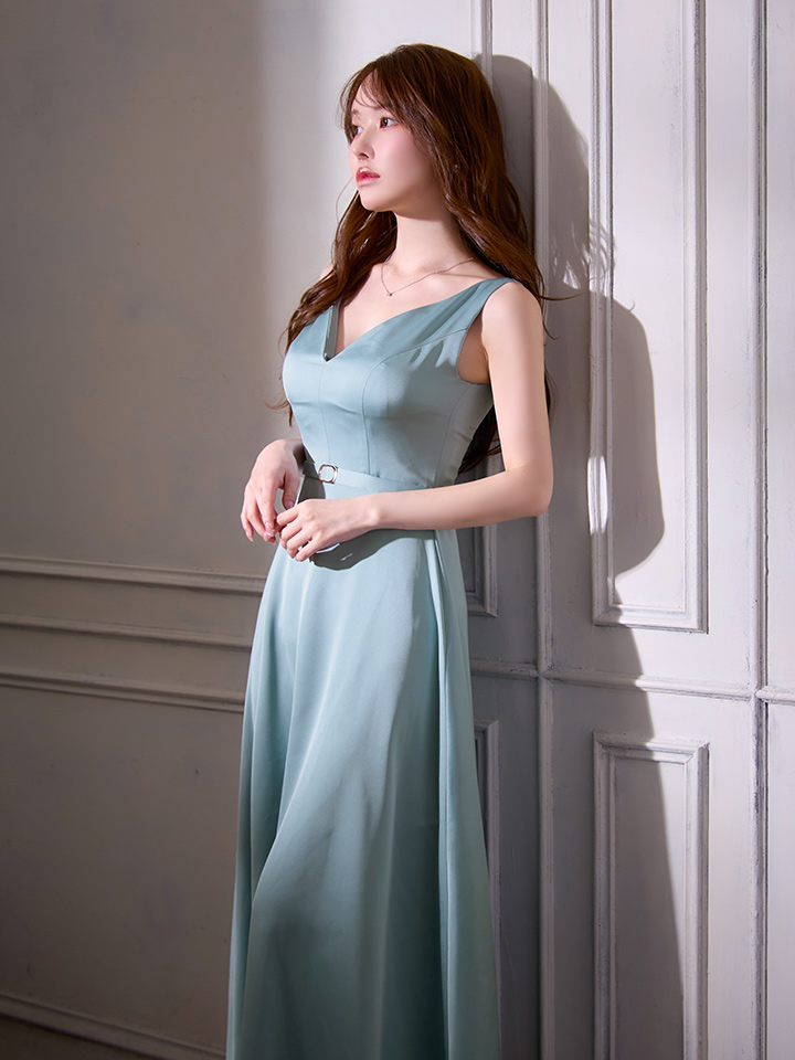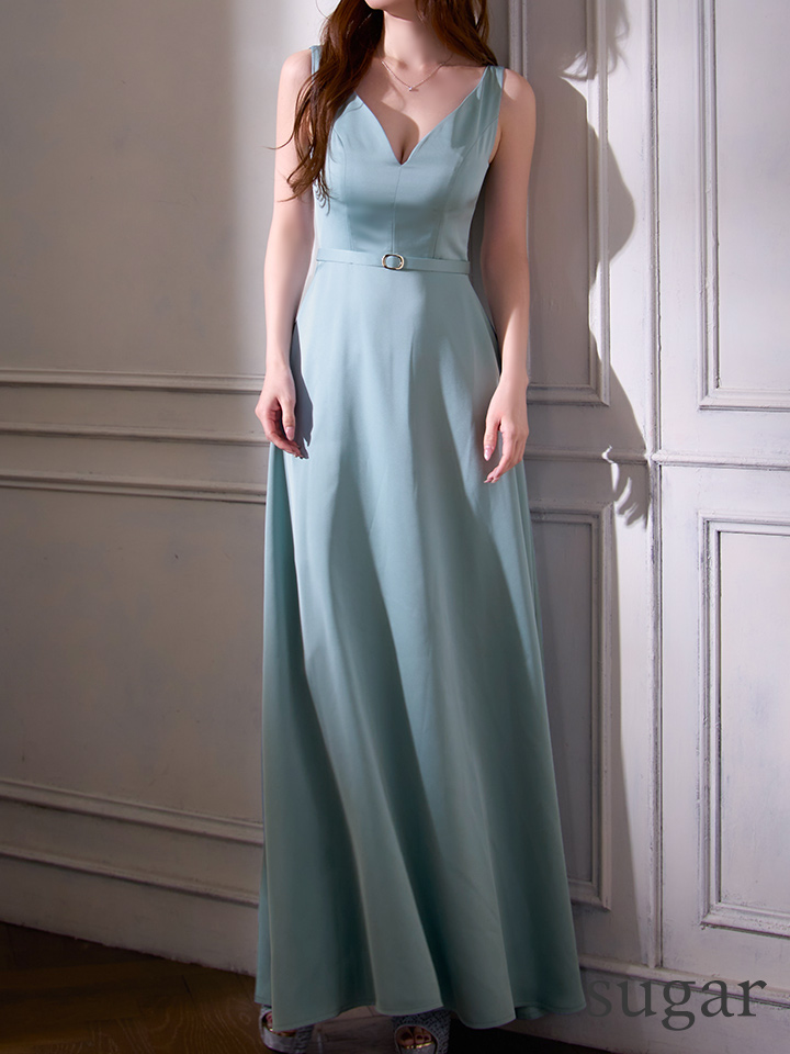 【VELIQUE/ヴェリーク】シンプル/ノースリーブ/ Vネック/ サテン/ ウエストマーク/ Aライン/ フレア/ ワンピース/ ロングドレス/ キャバドレスlong【HC02】 [BYRS-240-GR-S251216]
