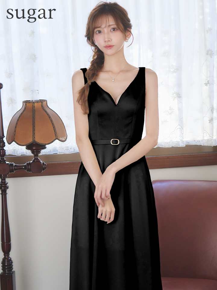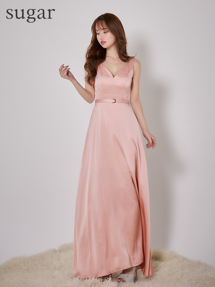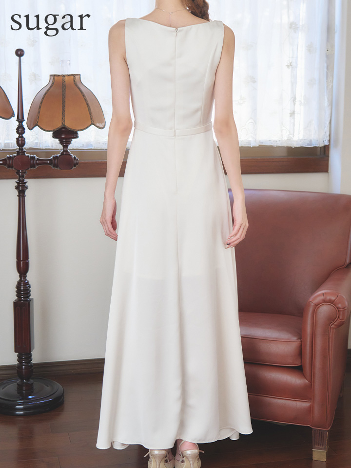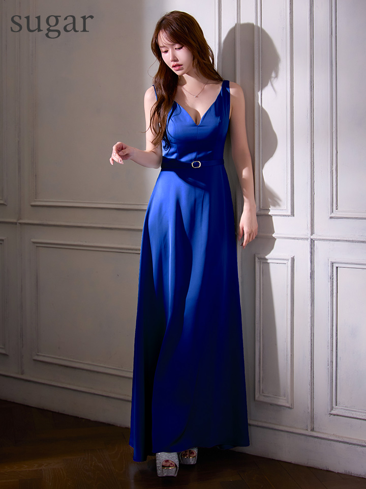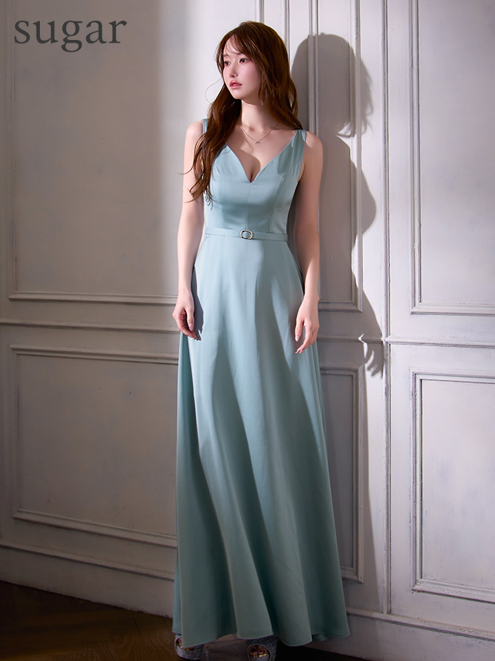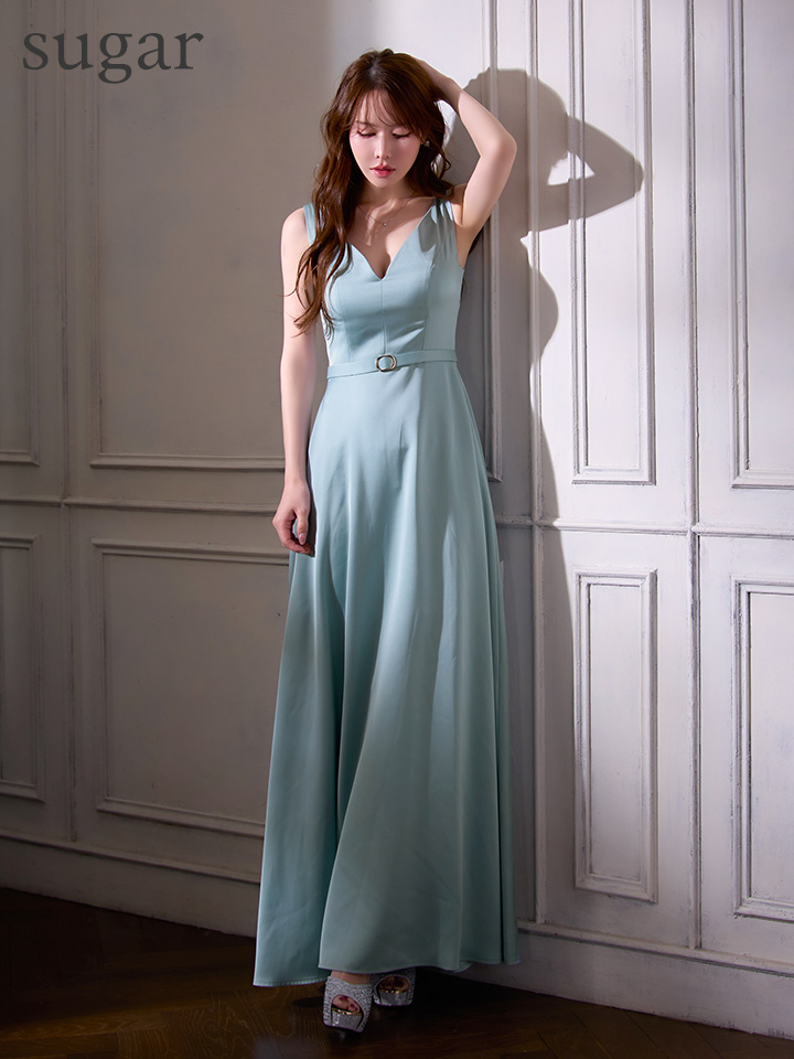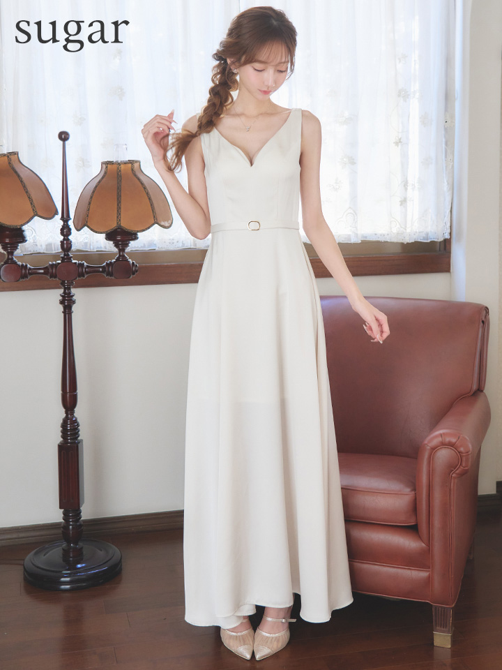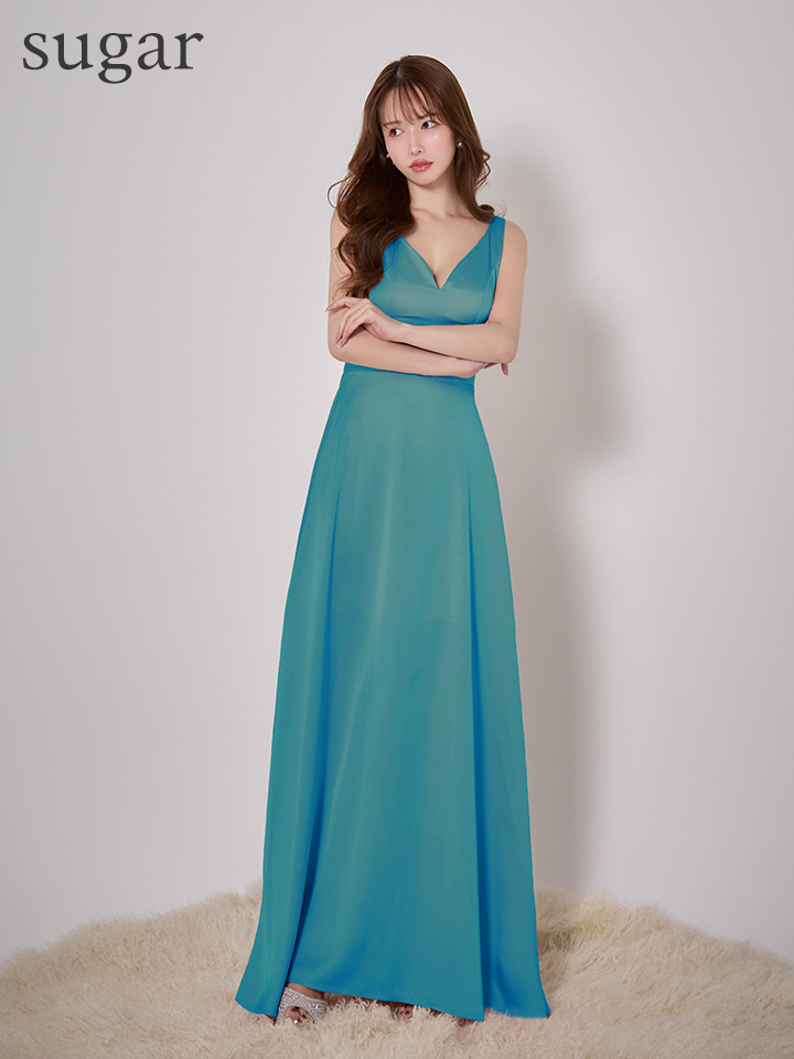大きく開いたVネックがデコルテを美しく強調させるフレアロングドレス。