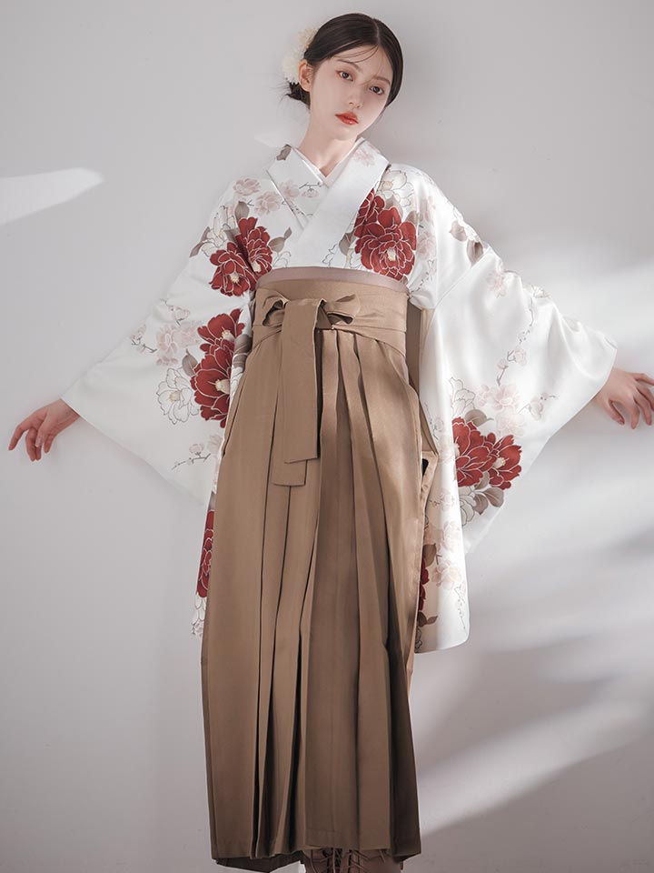 柔らかなベージュ地に、赤と白の椿が気品高く咲く上質な袴。