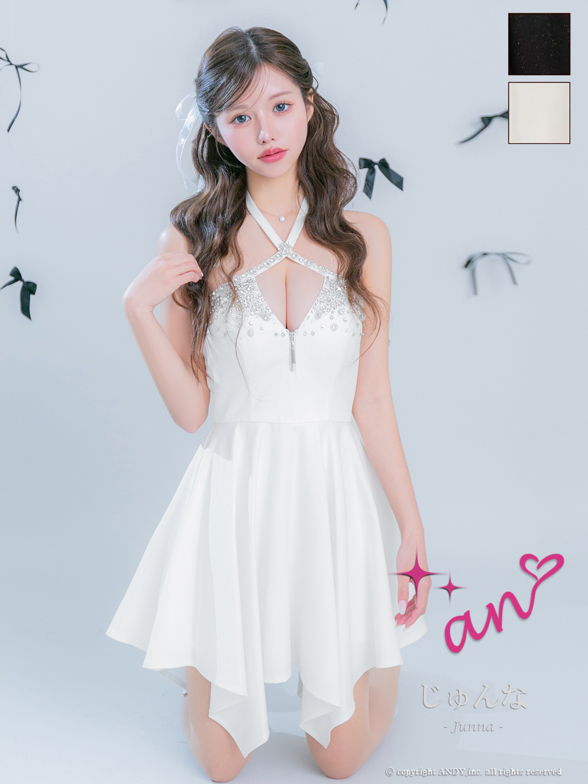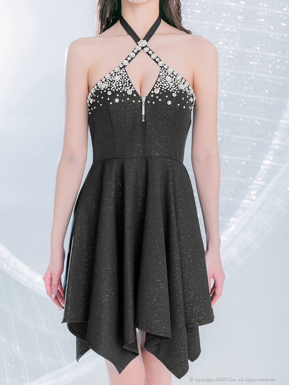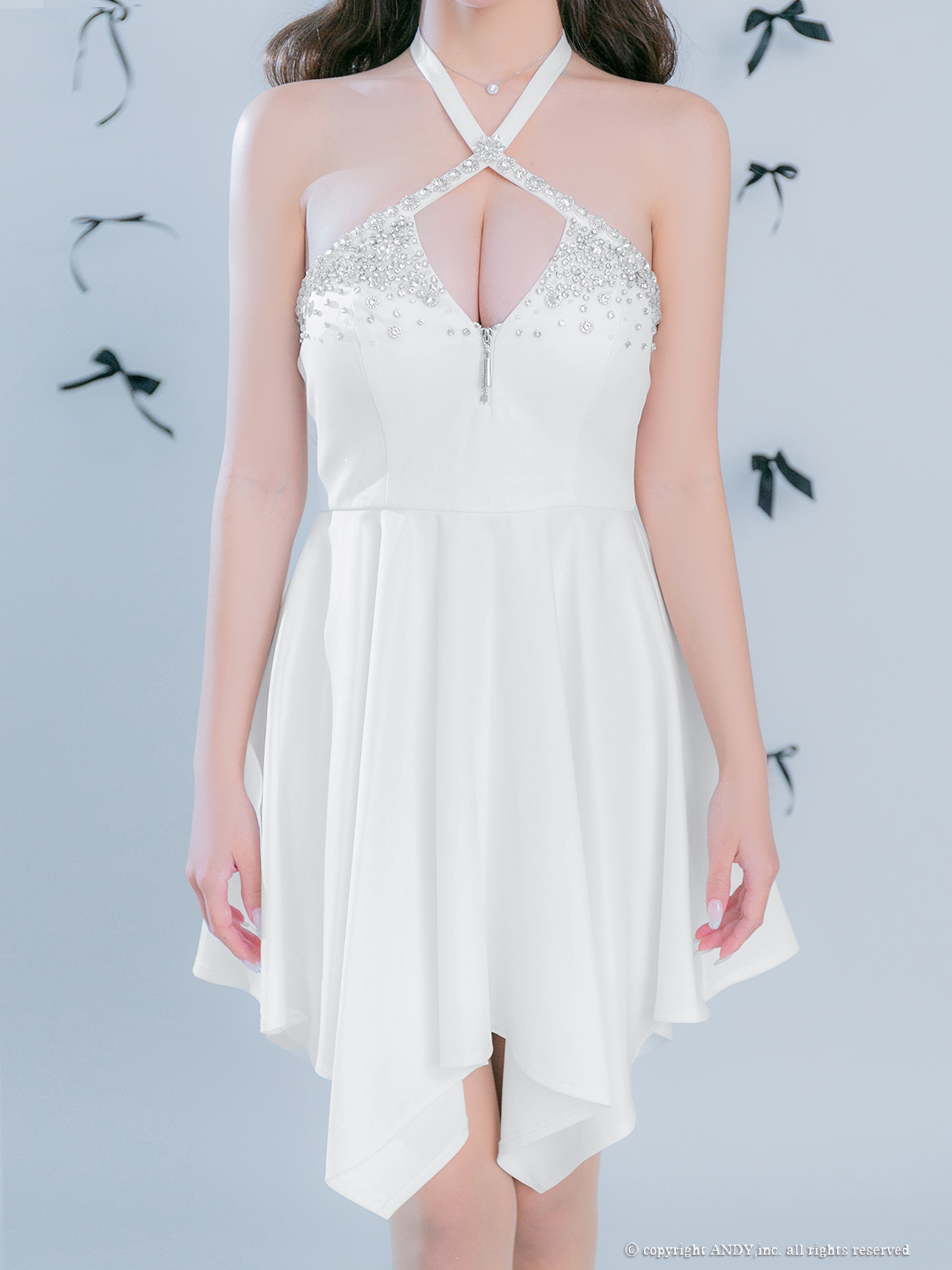 XSサイズあり【an/アン】ホルターネック/ バストカットアウト/ノースリーブ/ ビジュー/ イレヘムスカート/ フレア/ ミニドレス/ キャバドレス[OF05] [AOC4037-B-2512]