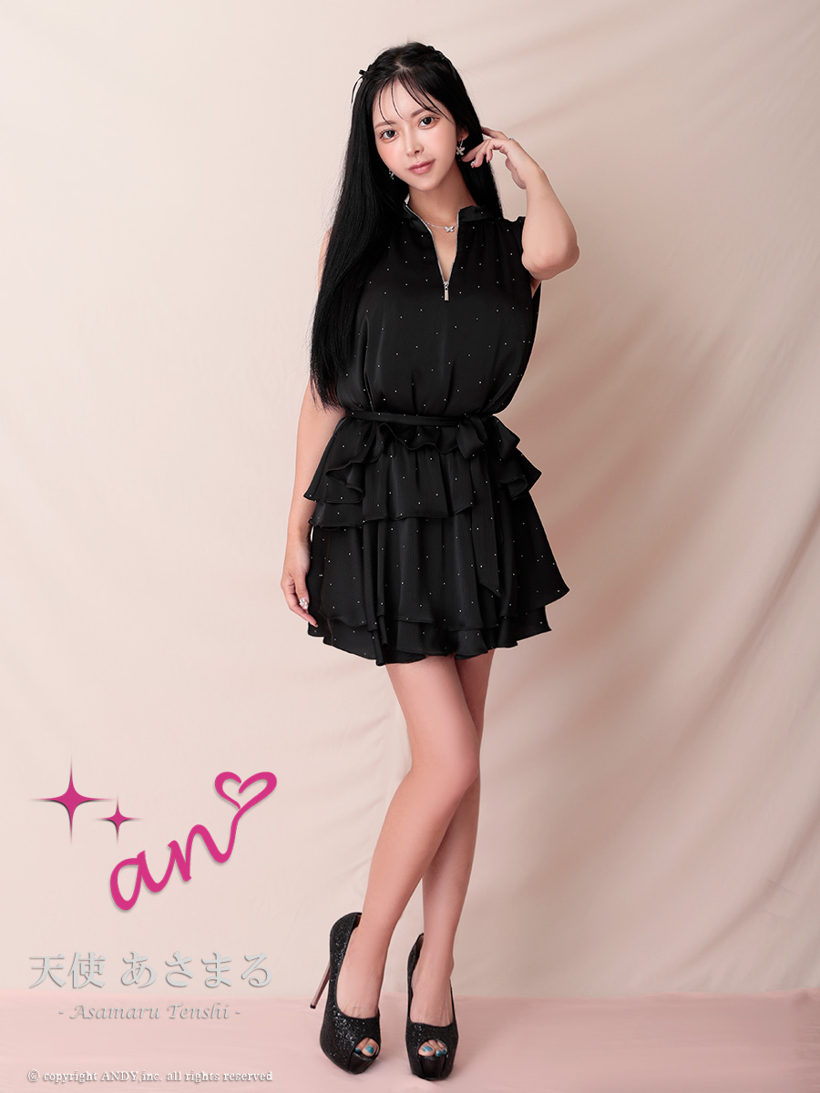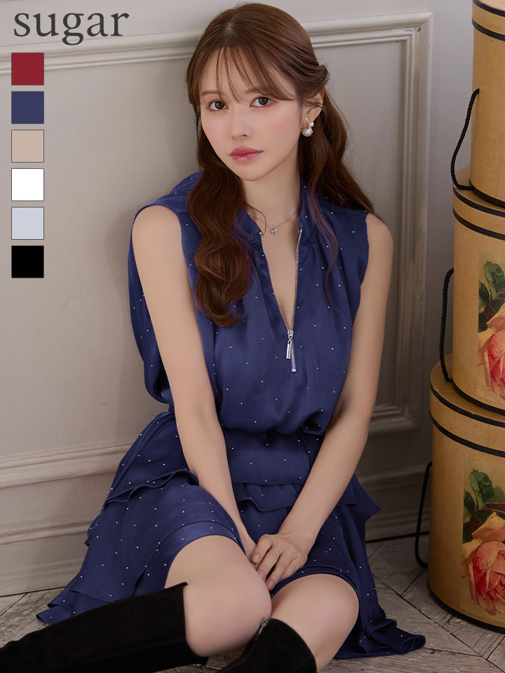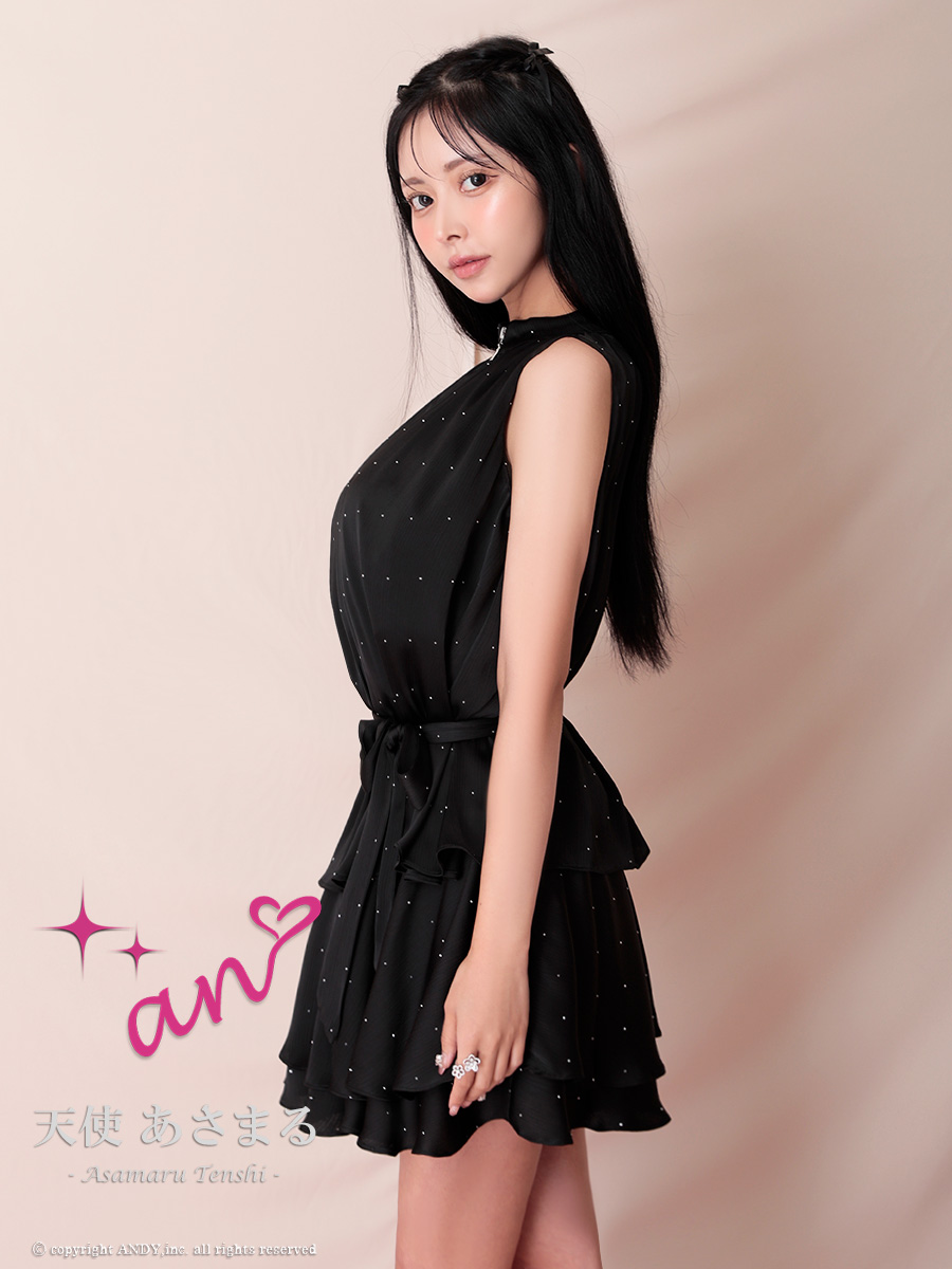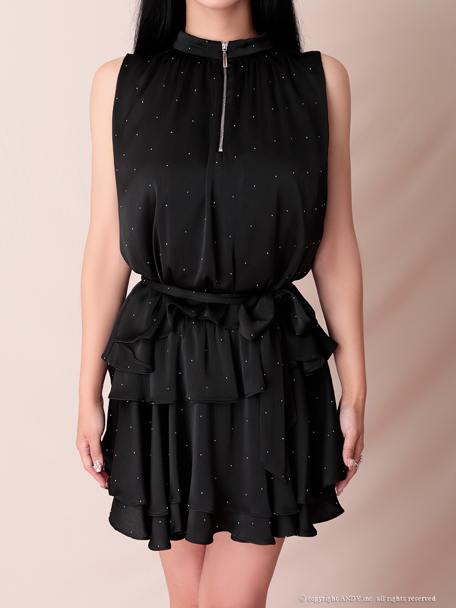 XSサイズあり【an /アン】ハイネック/ バストジップ/ ノースリーブ/ リボンベルト/ ティアード/ フリル/ フレア/ ラインストーン/ ミニドレス/ キャバドレス[OF05] [AOC3946-NV-S251222]