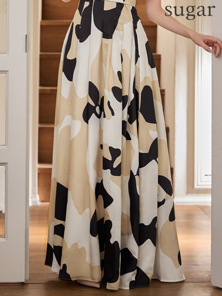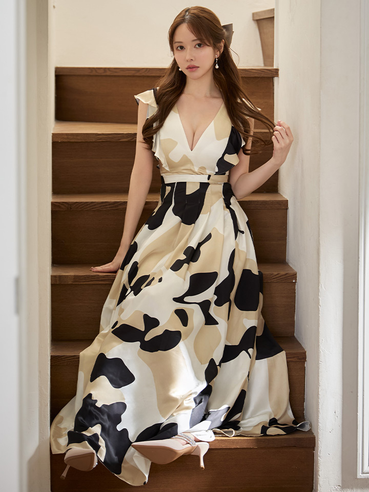 総柄マルチプリントがエレガントな気品漂うフレアロングドレス。