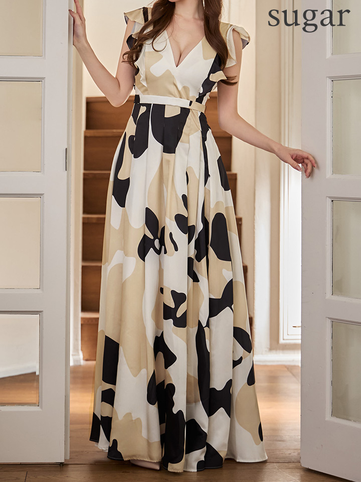 XS-Lサイズあり【ERUKEI エルケイ】マルチカラー/ プリント/ Vネック/ ショルダーフリル/ フレア/ ワンピース/ ロングドレス/ キャバドレスlong[OF2] [LKE25285-BxW-S2512]
