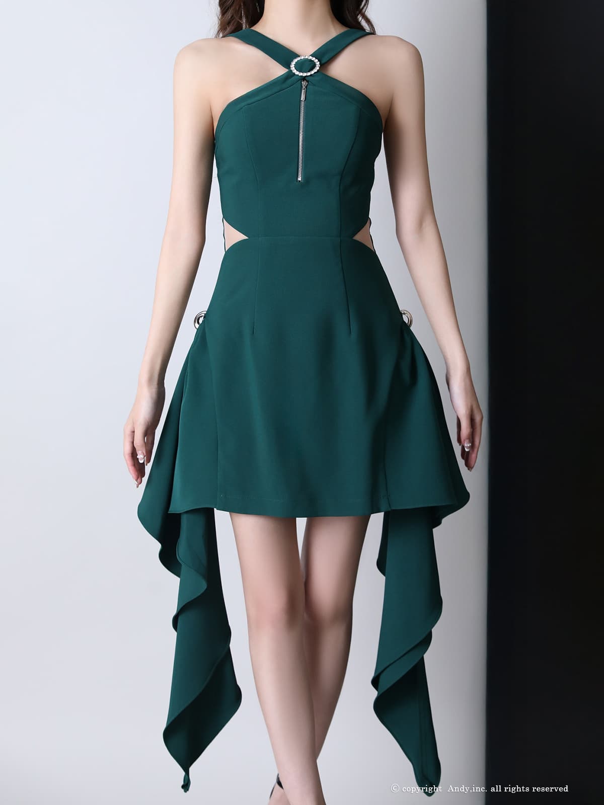 XSサイズあり【ANDY/アンディ】バストジップ/ サイドシアー/ ビジューバックル/ フリルリボン/ ノースリーブ/ タイト/ ミニドレス/ キャバドレス[OF05] [ON3032-GR-2512]