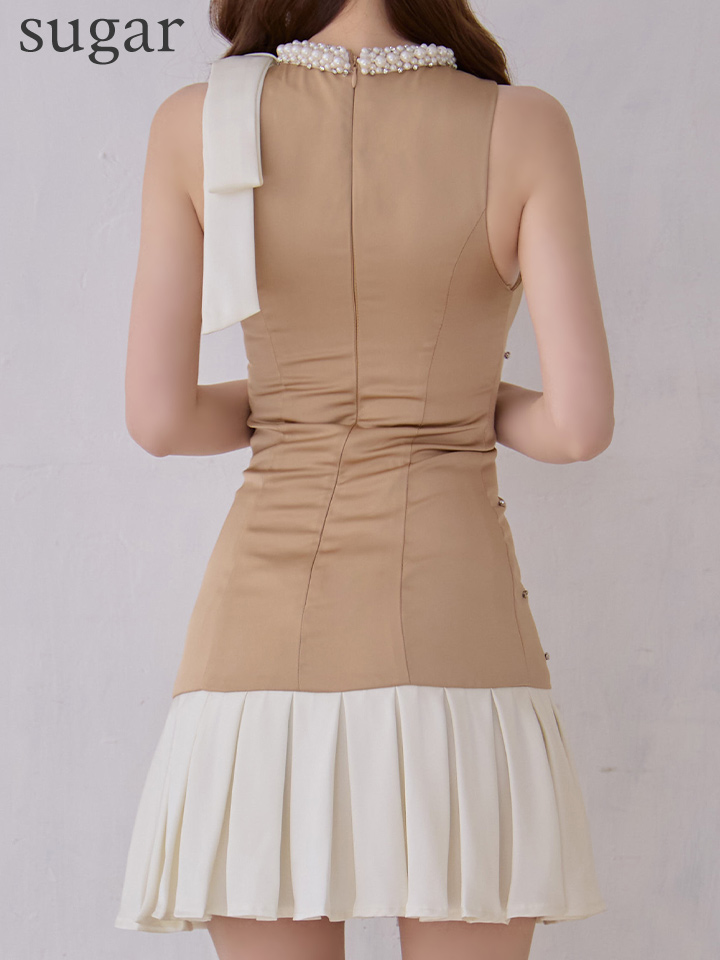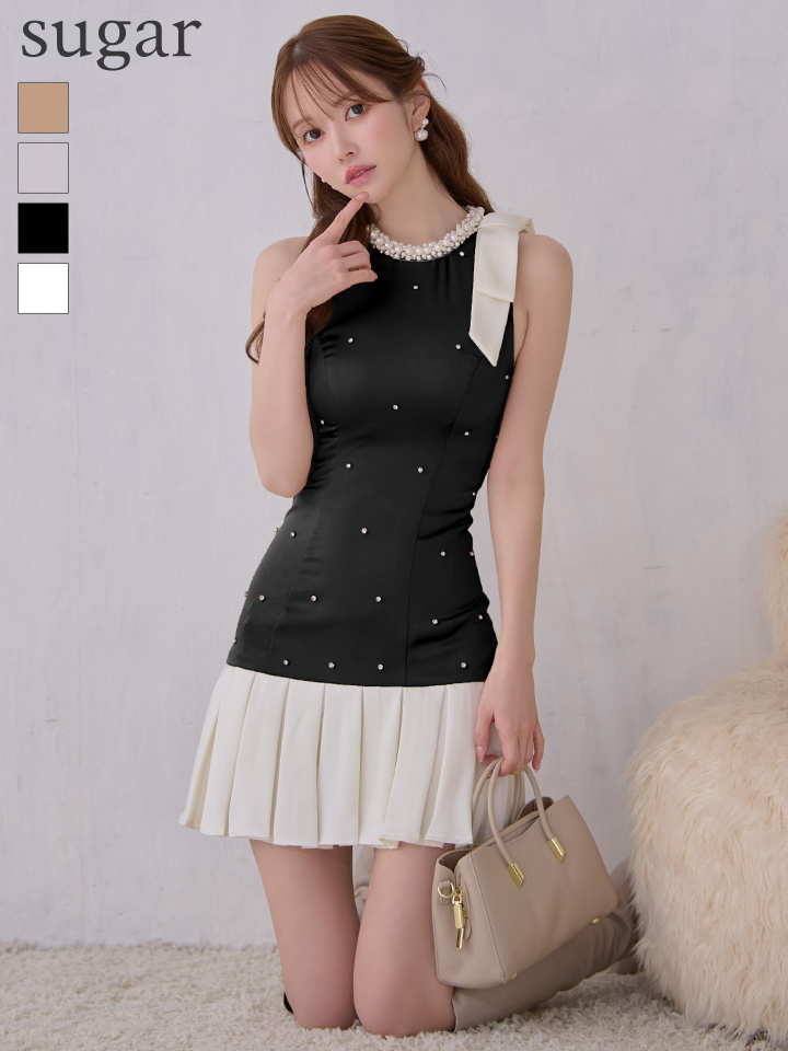 【JOLIESSE/ジョリエス】ショルダーリボン/ ネックパール/ ビジュー/ サテン/ ノースリーブ/ フレア/ ミニドレス/ キャバドレス[HC03] [A-0353-BR-S251223]