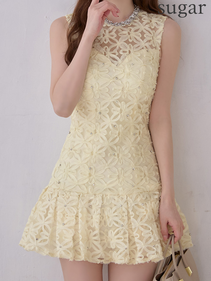 【JOLIESSE/ジョリエス】シアー/ ネックビジュー/ ノースリーブ/ プリーツ/ フレア/ ミニドレス/ キャバドレス[HC03] [A-0354-cream-S251223]