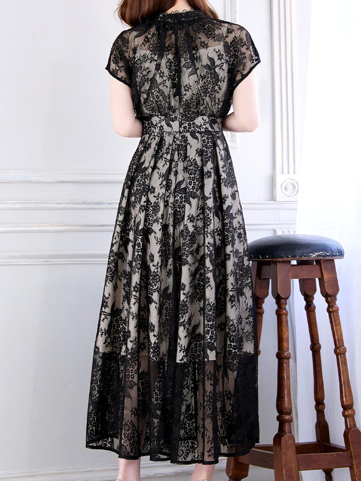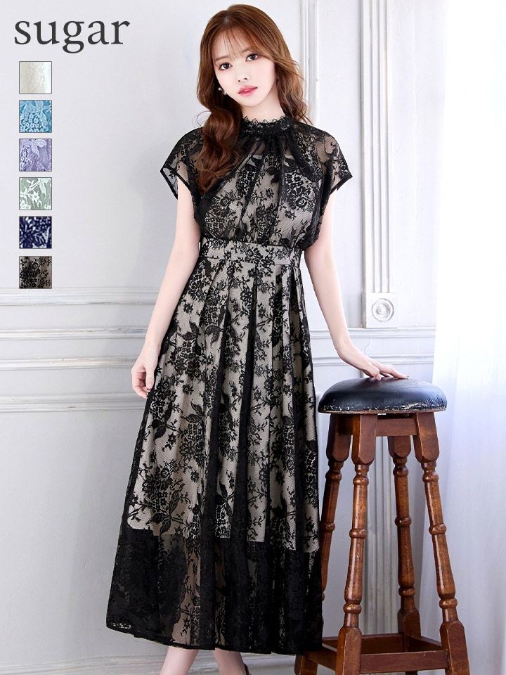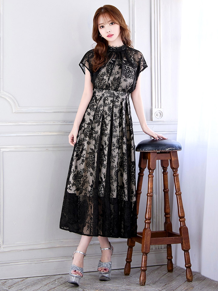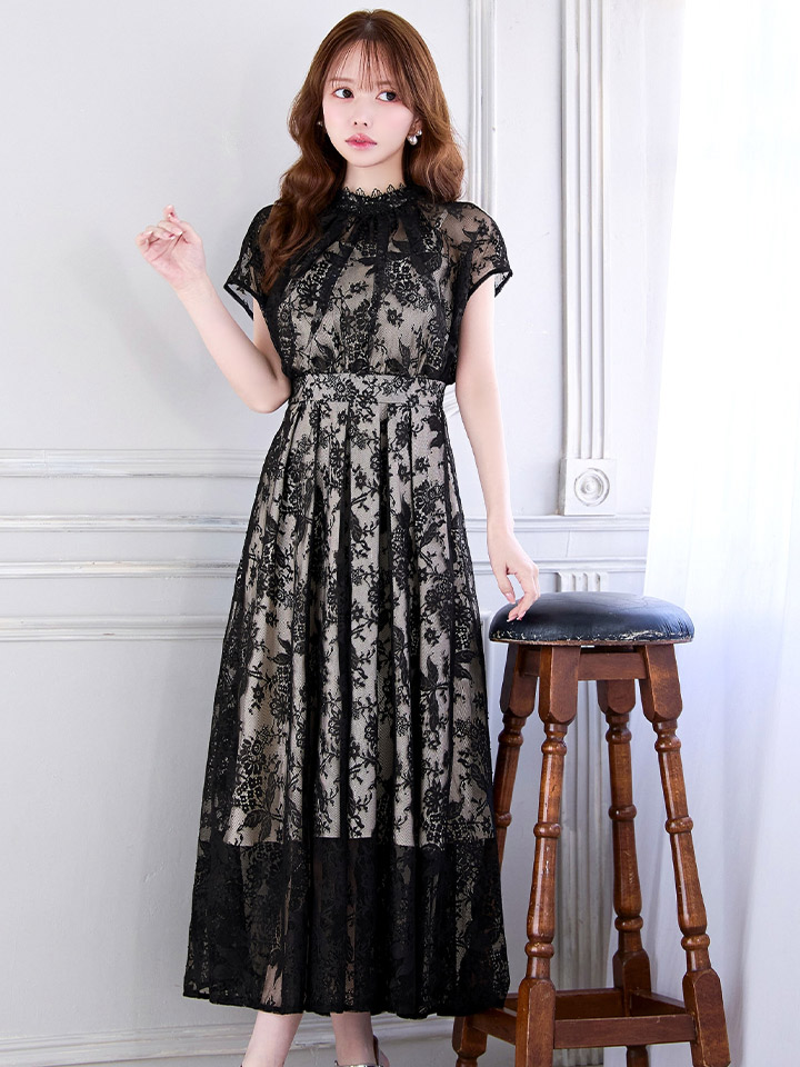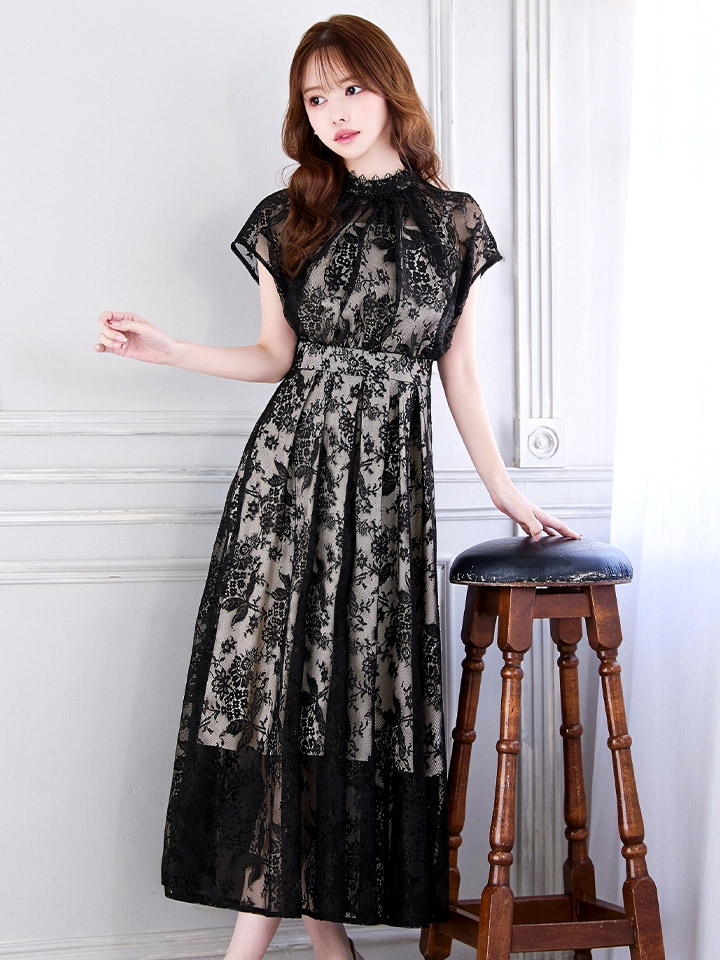 透け感のあるフラワーレースにハイネックが大人クラシカルな雰囲気のミモレ丈ワンピースドレス♡