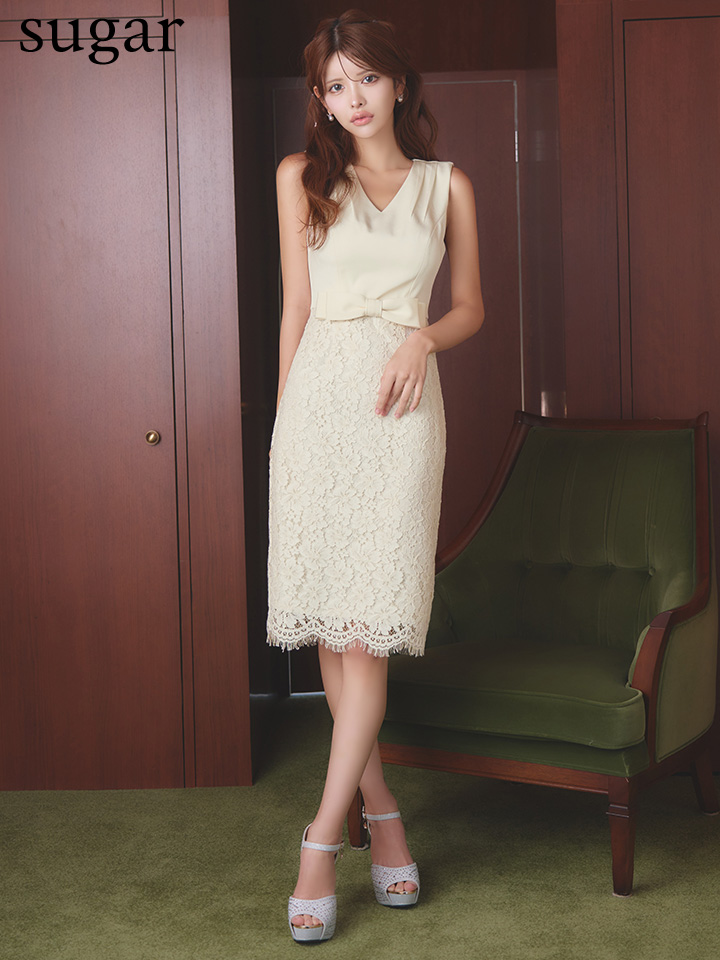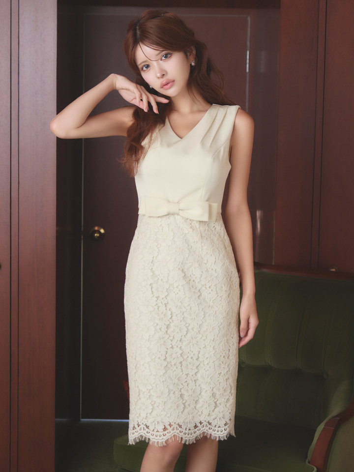 XS-Lサイズあり【SETTAN/セッタン】フラワー刺繍/ レース/ ウエストリボン/ ノースリーブ/ Vネック/ 膝丈/ タイト/ ミディアムドレス/ キャバドレス[OF2] [LKS25021-IV-S2512]