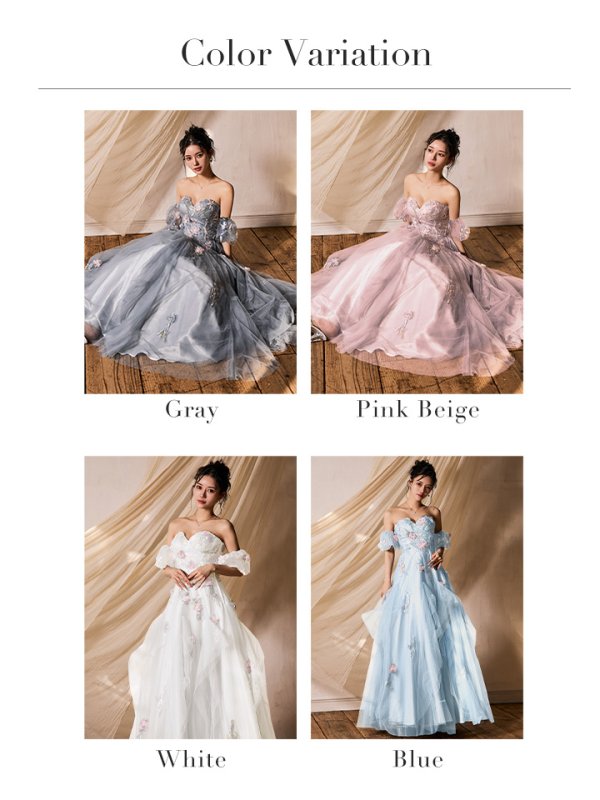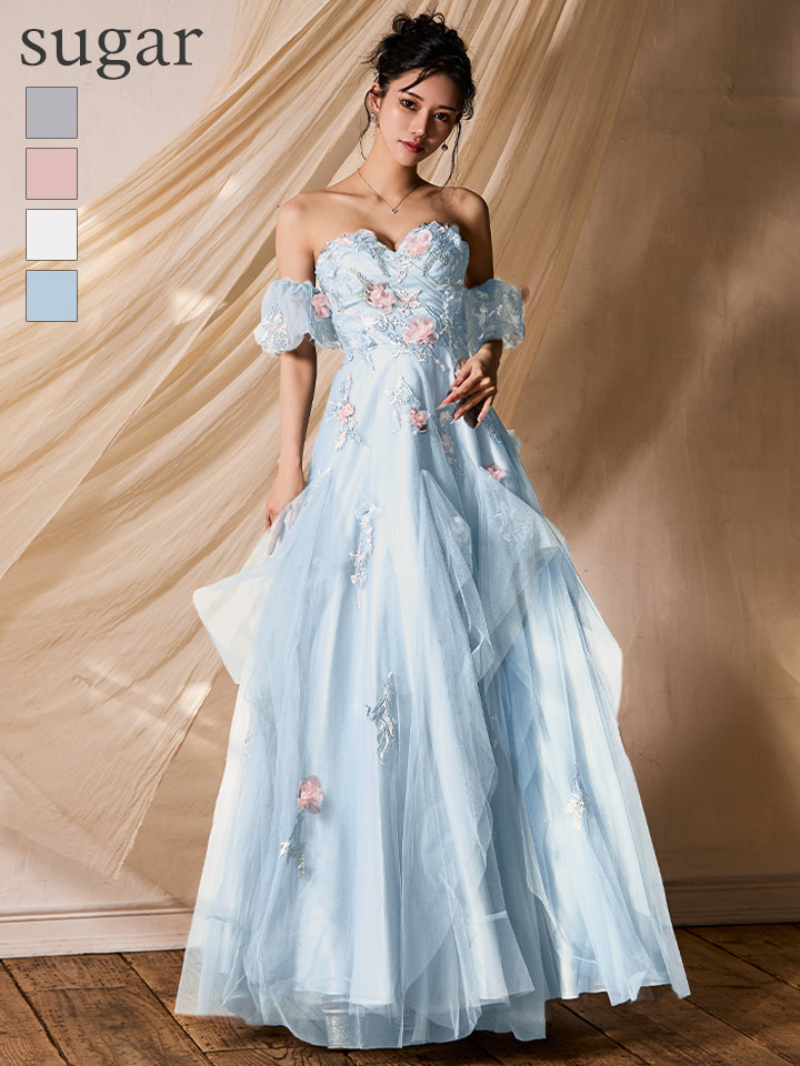 【JEAN MACLEAN/ジャンマクレーン】チュール/ ベア/ オフショル/ フラワー刺繍/ フレア/ パフスリーブ/ プリンセス/ ロングドレス/ キャバドレス long[OF2A] [51829-JM-W-S251225]