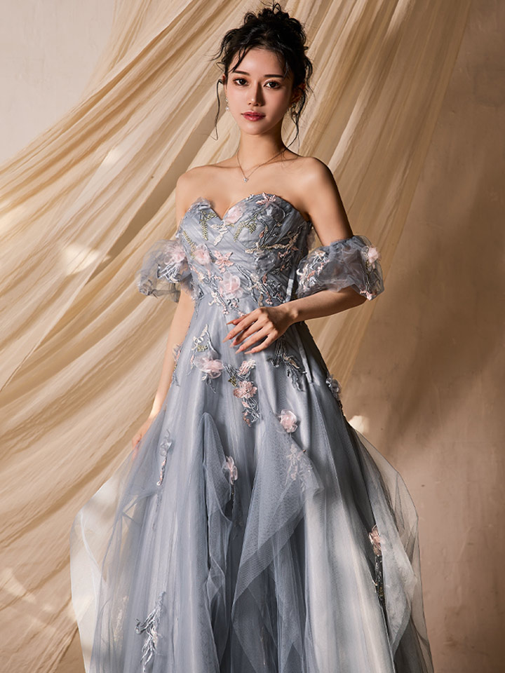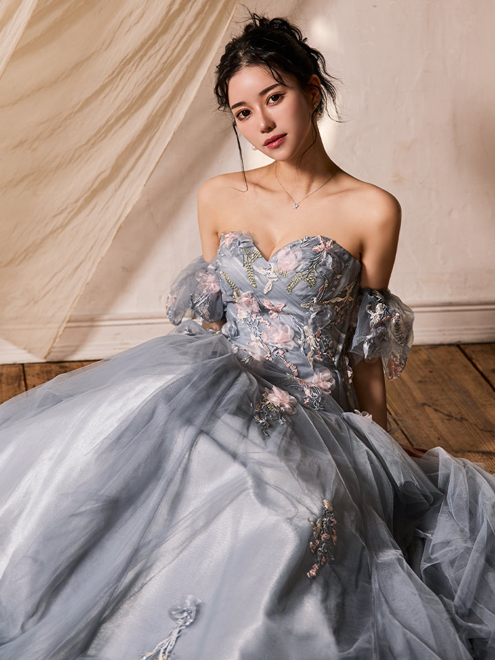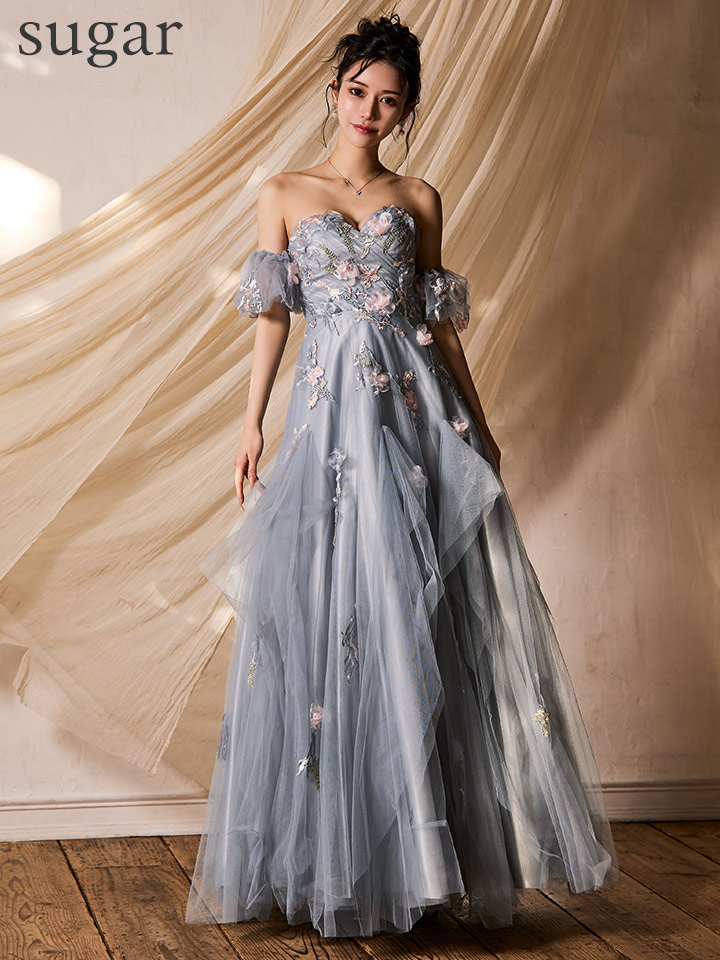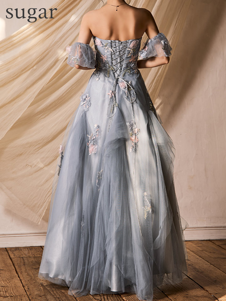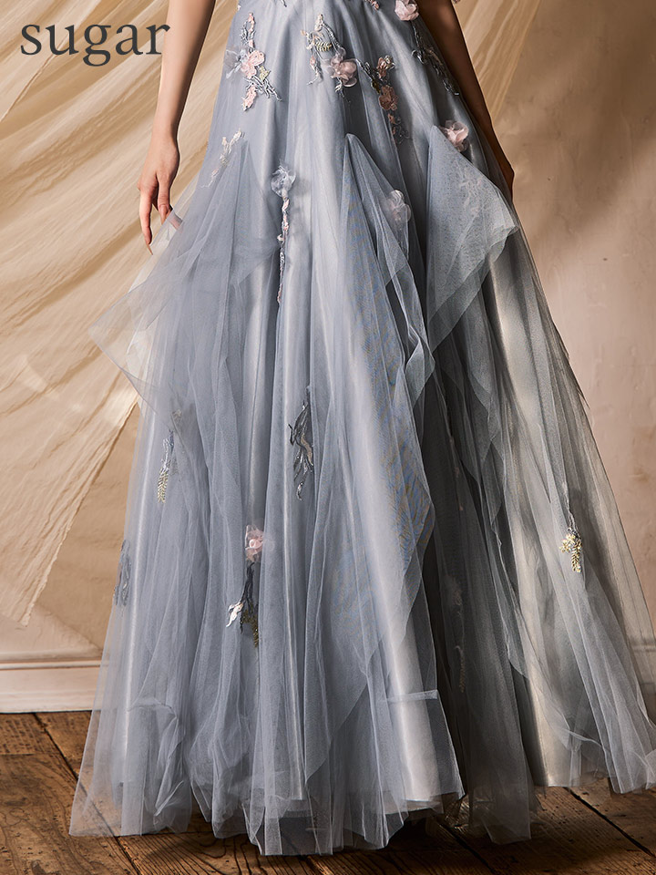 フラワー刺繍とたっぷりのチュールがロマンティックなフレアロングドレス♡