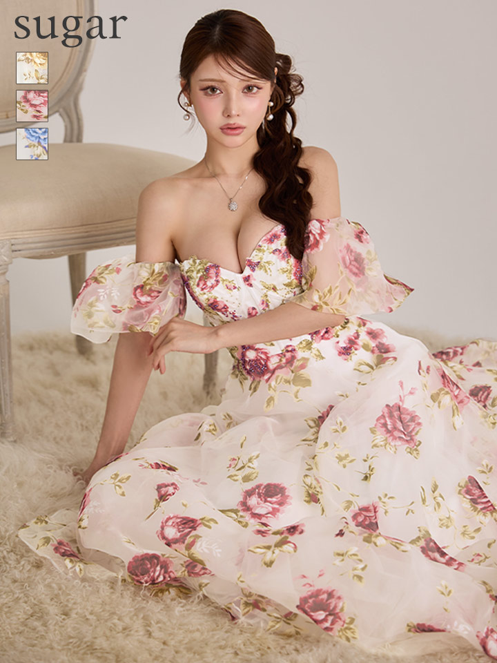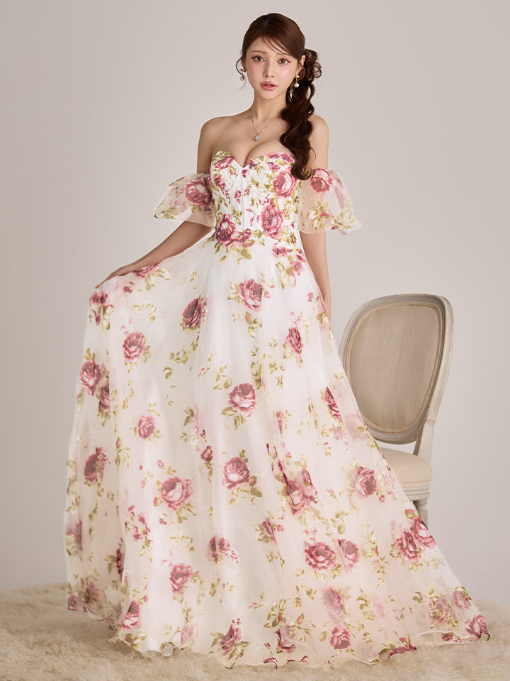 Lサイズあり【JEAN MACLEAN/ジャンマクレーン】フラワープリント/ オーガンジー/ ベア/ パフスリーブ/ 袖あり/ プリンセス/ Aライン/ ロングドレス / キャバドレス long[OF2A] [41593-JM-RP-S251225]