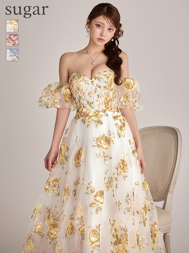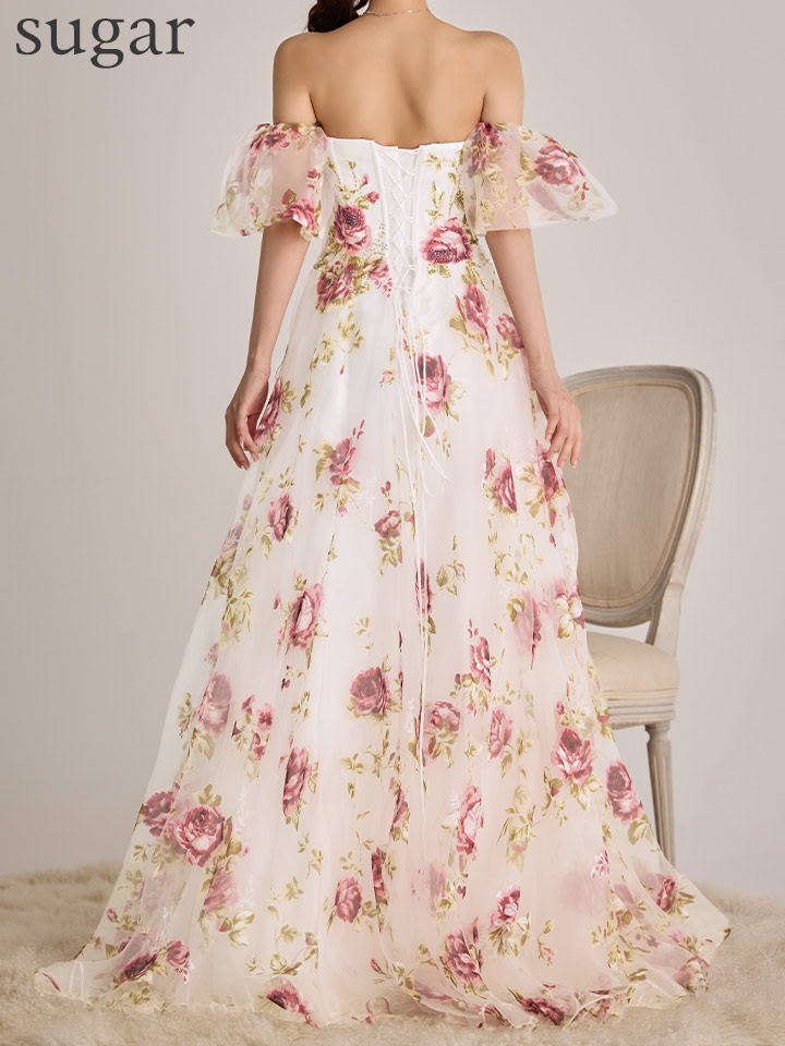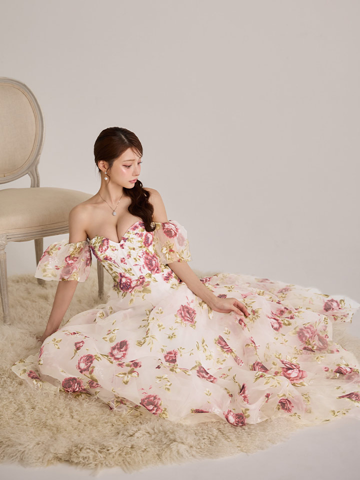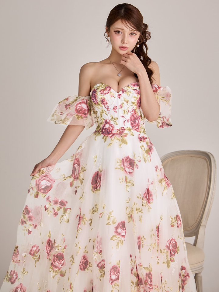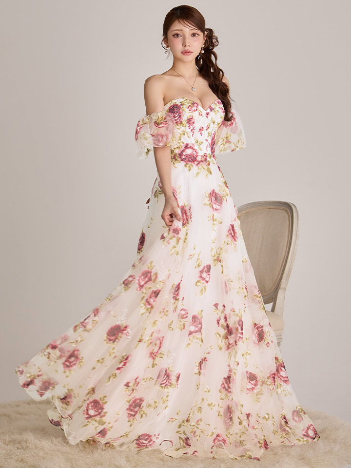 フェミニンなフラワープリントxふんわりとしたパフスリーブが目を引くプリンセスロングドレス♡