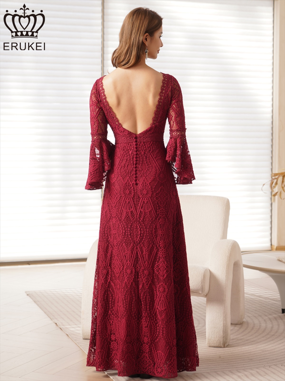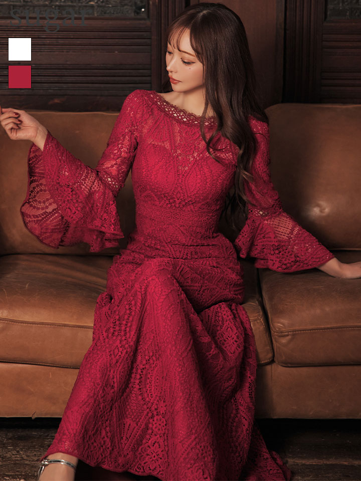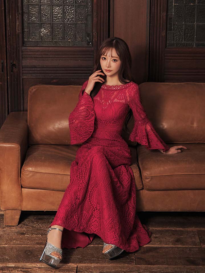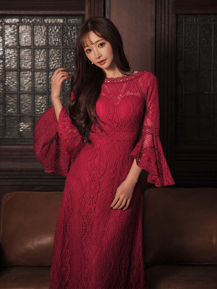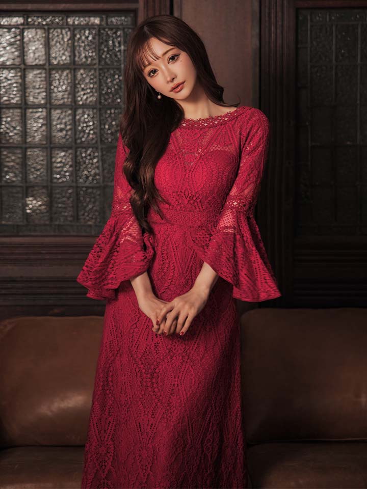 XS-Lサイズあり【ERUKEI エルケイ】 総レース/ ベルスリーブ/ Aライン/ エレガント/ ロングドレス/ キャバドレス[OF2] [LKE24083-WR-S2512]