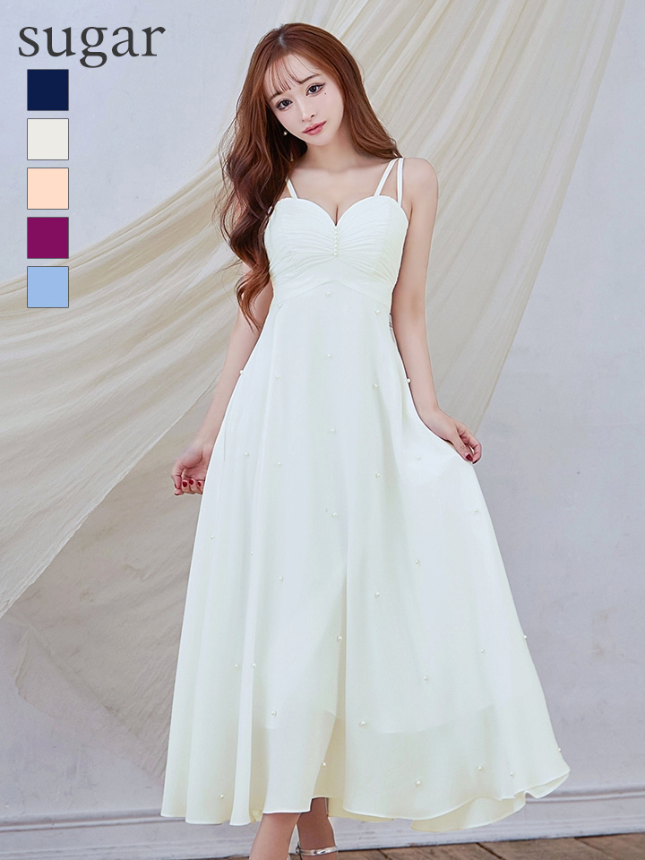 全体に散りばめられたパールが華やかなフレアミディアムドレス♡