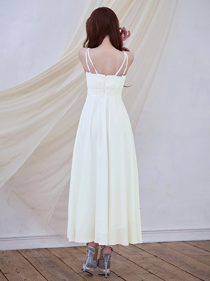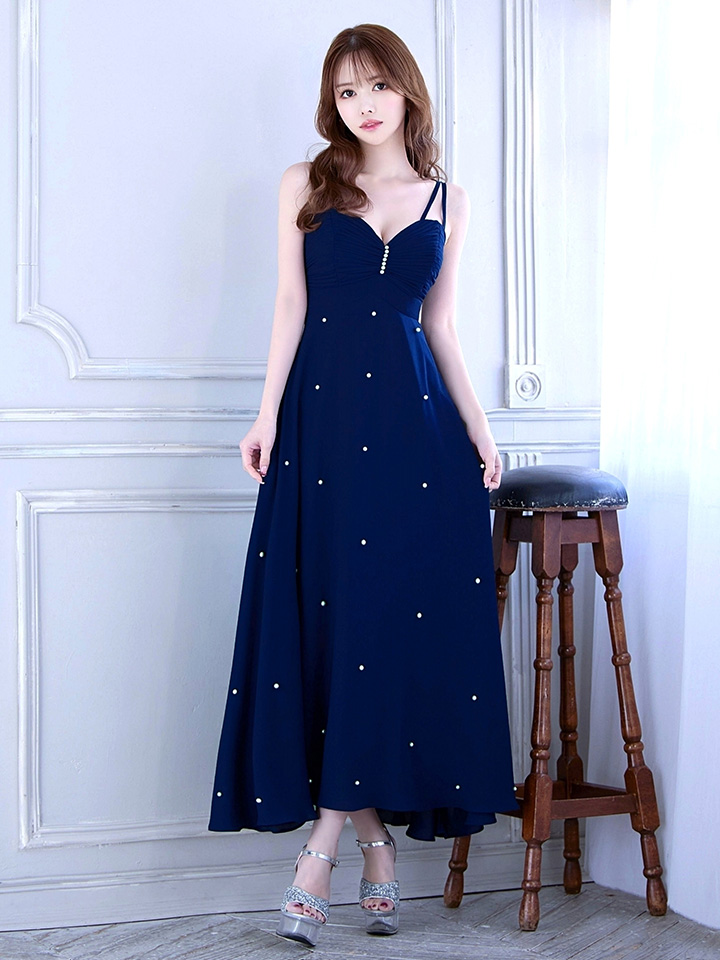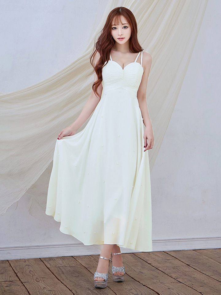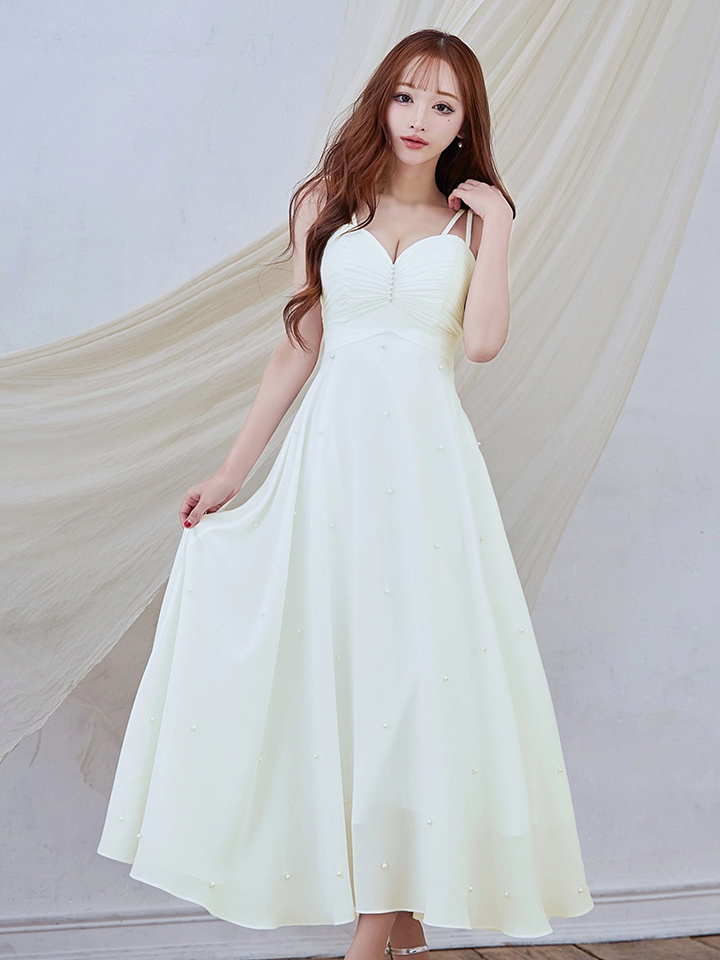 Lサイズあり【ISA FERRIS/ イサフェリス】【OF05】シンプル/ キャミソール/ パール/ フレア/ Aライン/ ミモレ丈/ ワンピース/ ミディアムドレス/ キャバドレス [F60238HL-IV-S2512]