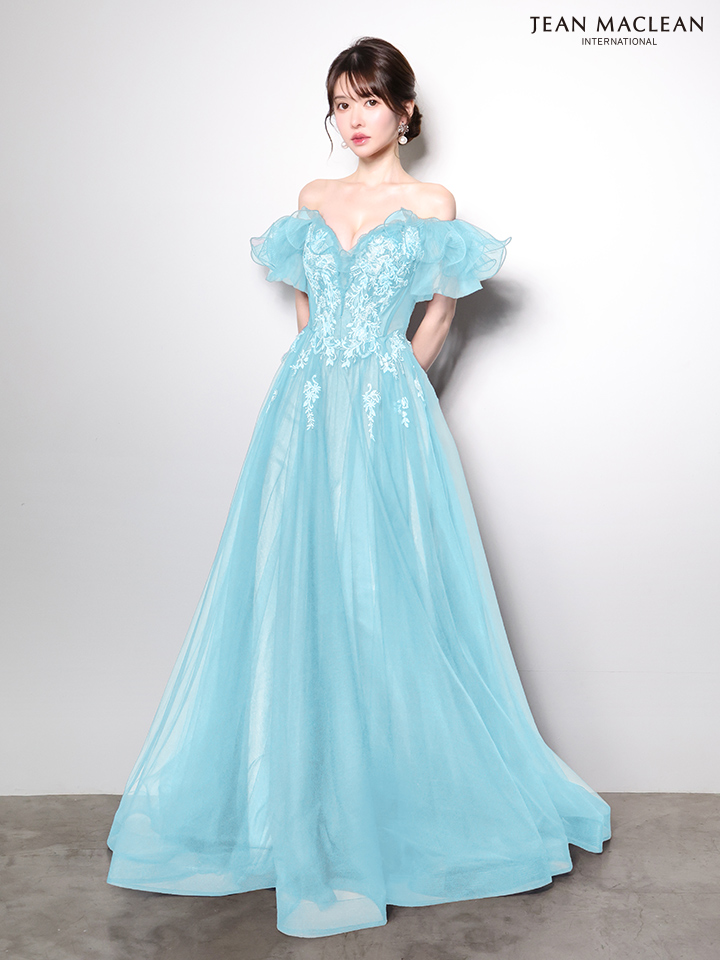 【JEAN MACLEAN/ジャンマクレーン】ボリュームフリルスリーブ/ オフショル/ シアー/ フラワー刺繍/ チュール/ フレア/ Aライン/ プリンセス/ ロングドレス/ キャバドレス long[OF2A] [51006-JM-BL-2601]