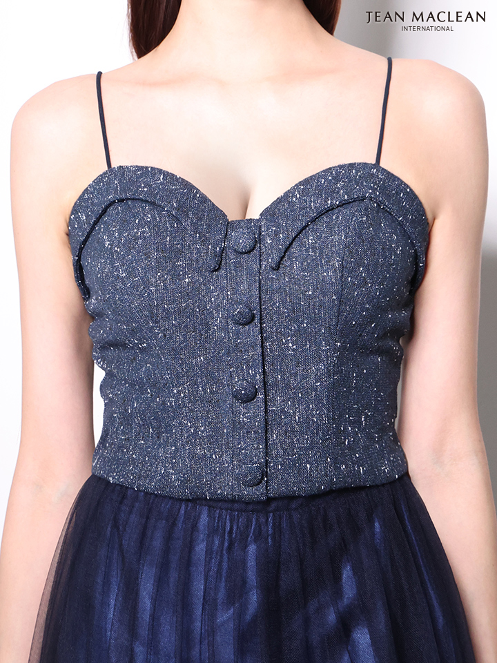 華奢な肩紐がデコルテ周りを強調し、魅力的に演出します。