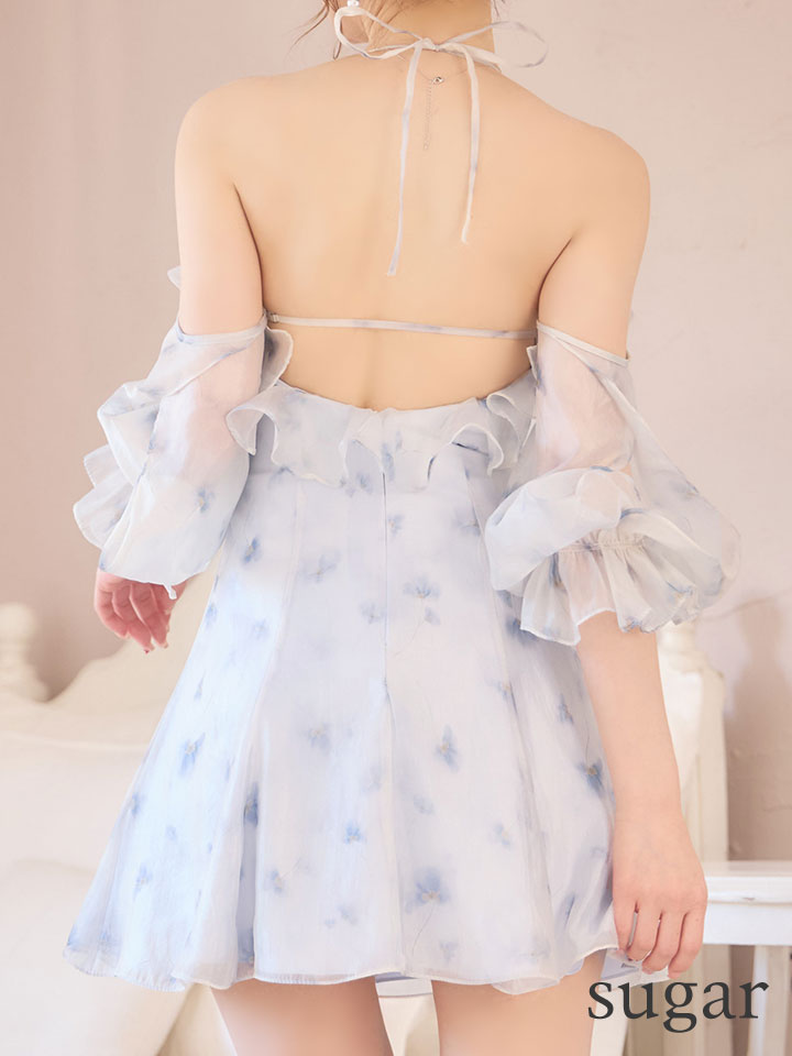 透け感のあるシフォン素材にフラワープリントを施した、軽やかなミニドレス。