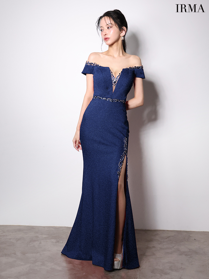【IRMA/イルマ】ビジュー/ ラメ/ オフショル/ バストカット/ スリット/ タイト/ ロングドレス/ キャバドレス long[OF2A] [51997-IR-DKBL-2601]