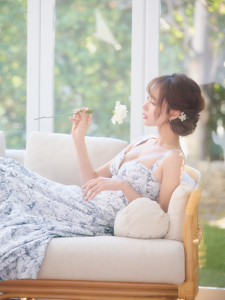 大人っぽい花柄のフレアロングドレス。