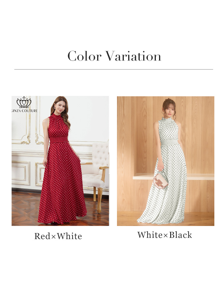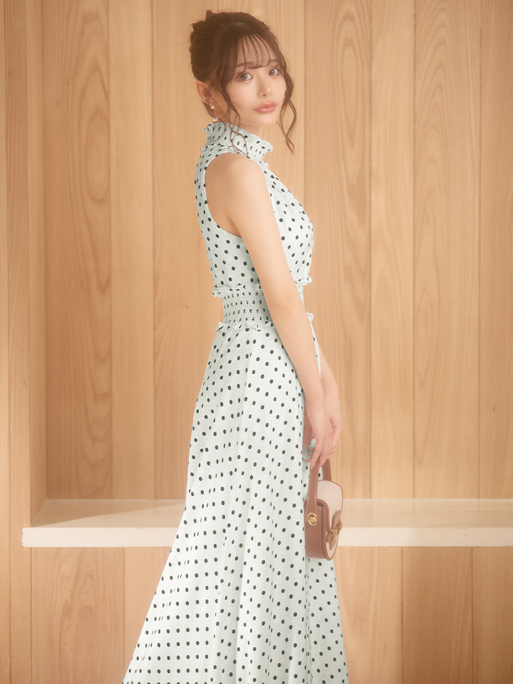 XS-Lサイズあり【ERUKEI エルケイ】ドット/ ネックフリル/ ウエストマーク/ マキシ丈/ アメリカンスリーブ/ Aライン/ ワンピース/ ロングドレス/ キャバドレス long[OF2] [LKC26165-WxB-S260109]