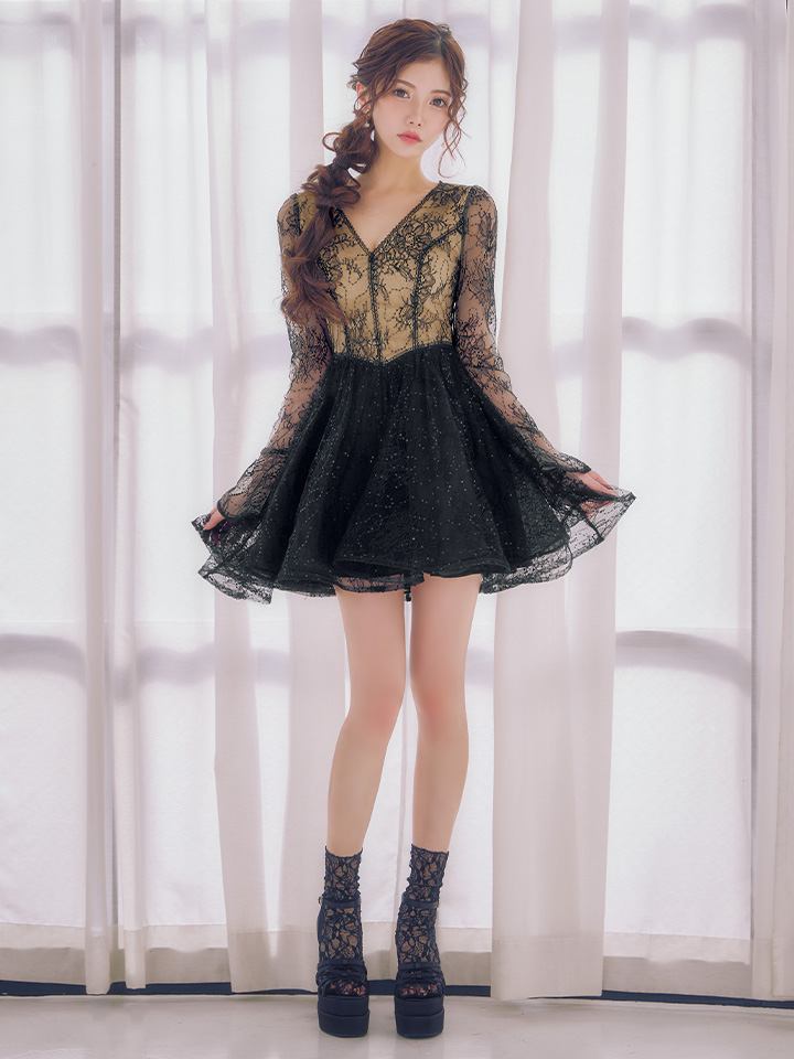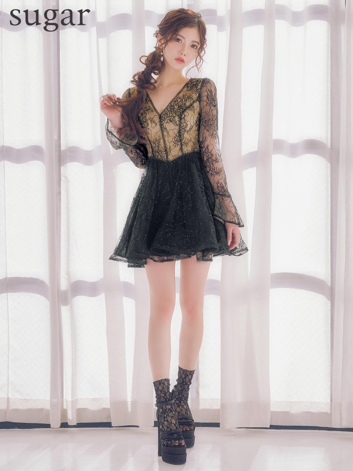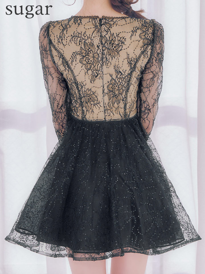 XS-Lサイズあり【SETTAN/セッタン】ロングスリーブ/ シースルー/ 刺繍レース/ Vネック/ スパンコール/ チュール/ Aライン/ フレア/ ミニドレス / キャバドレス[OF2] [LKS25282-B-S260110]