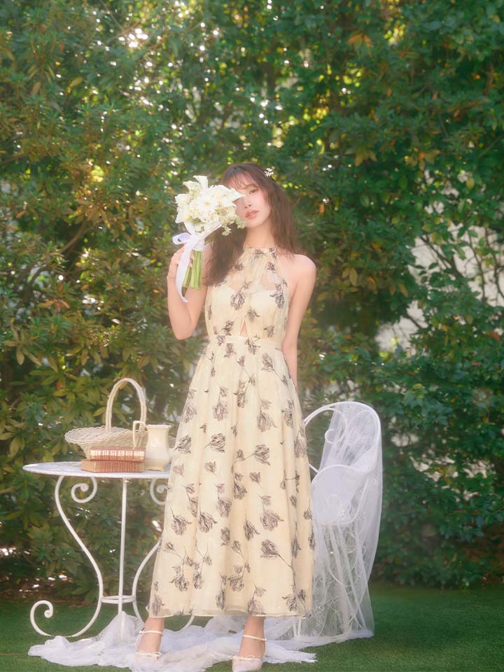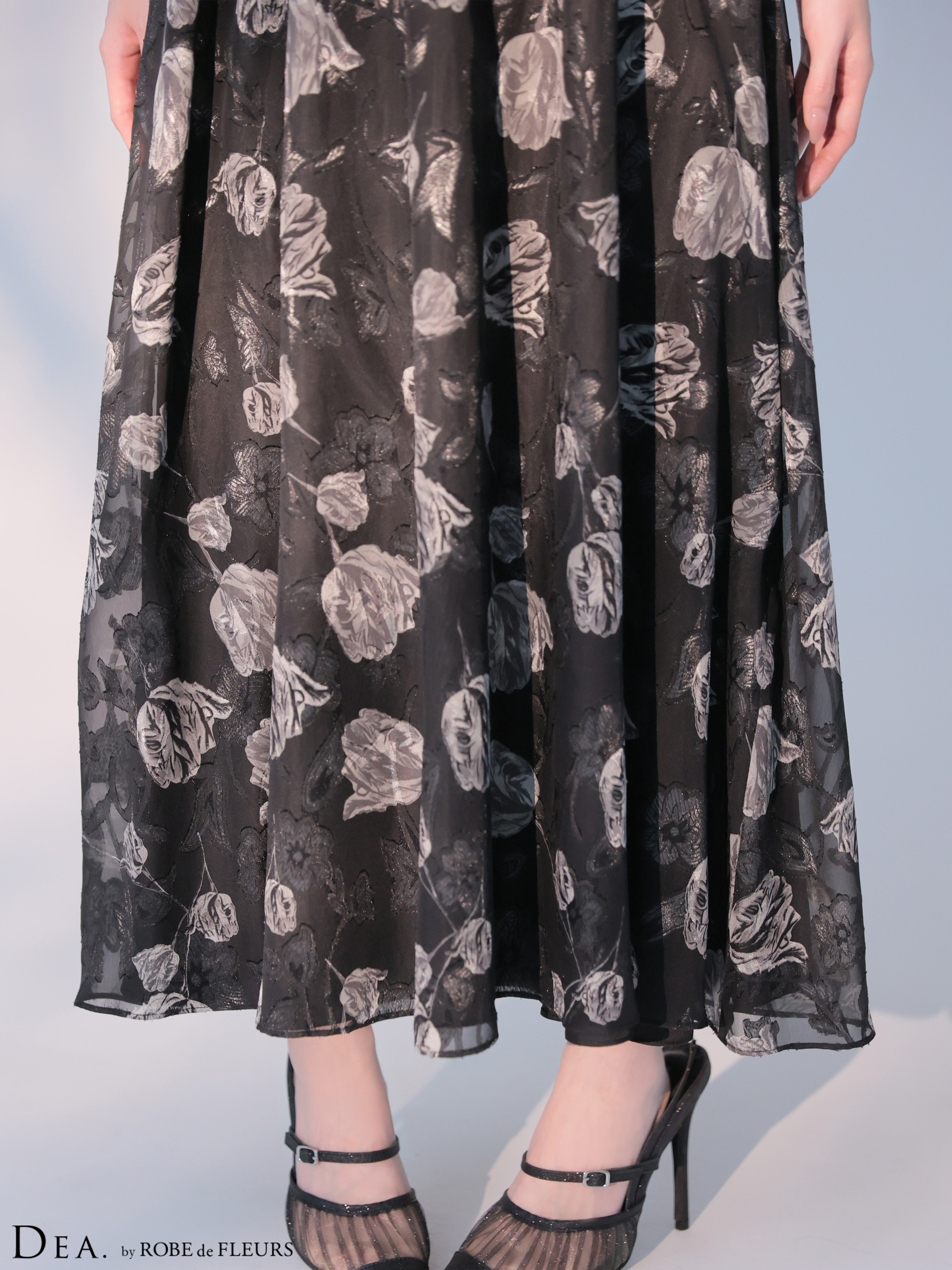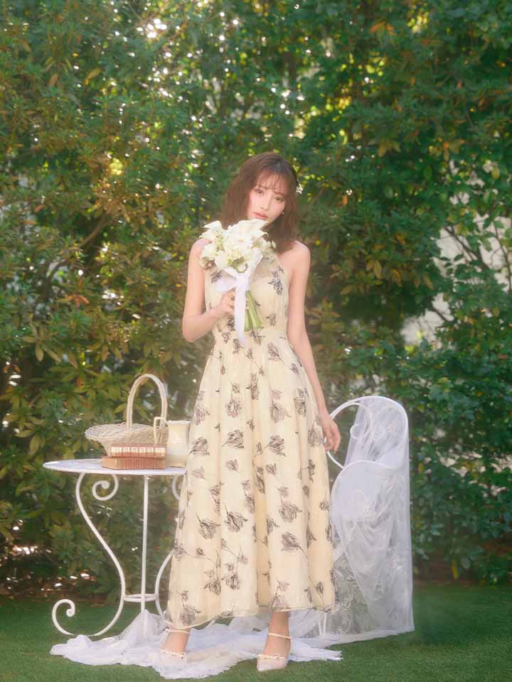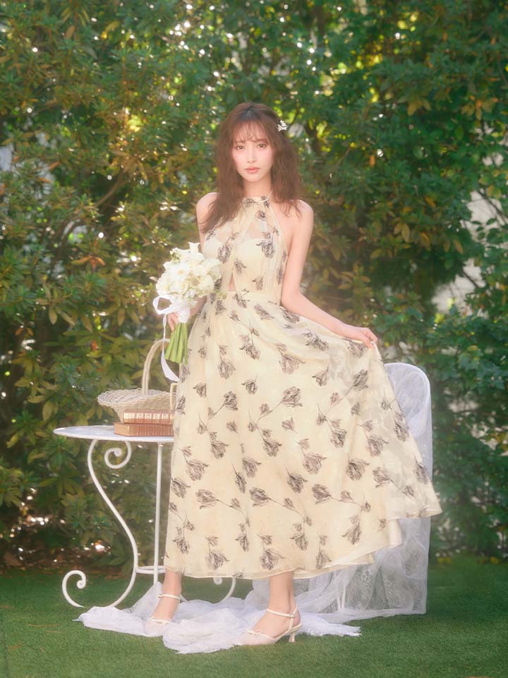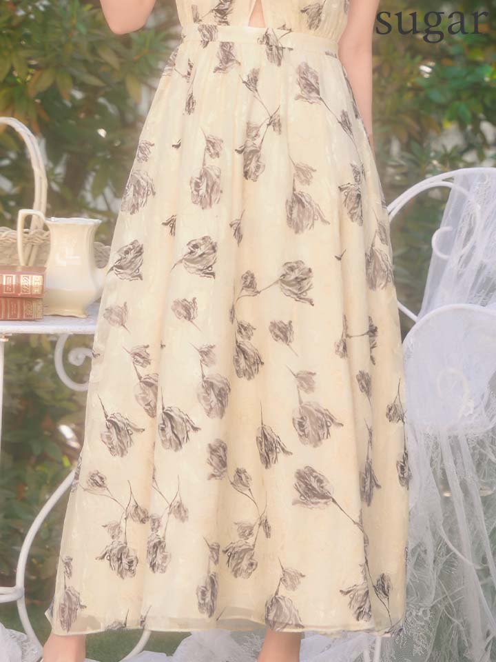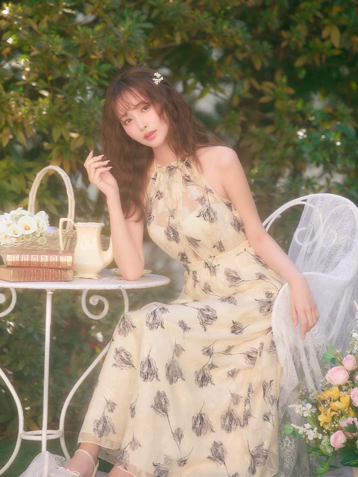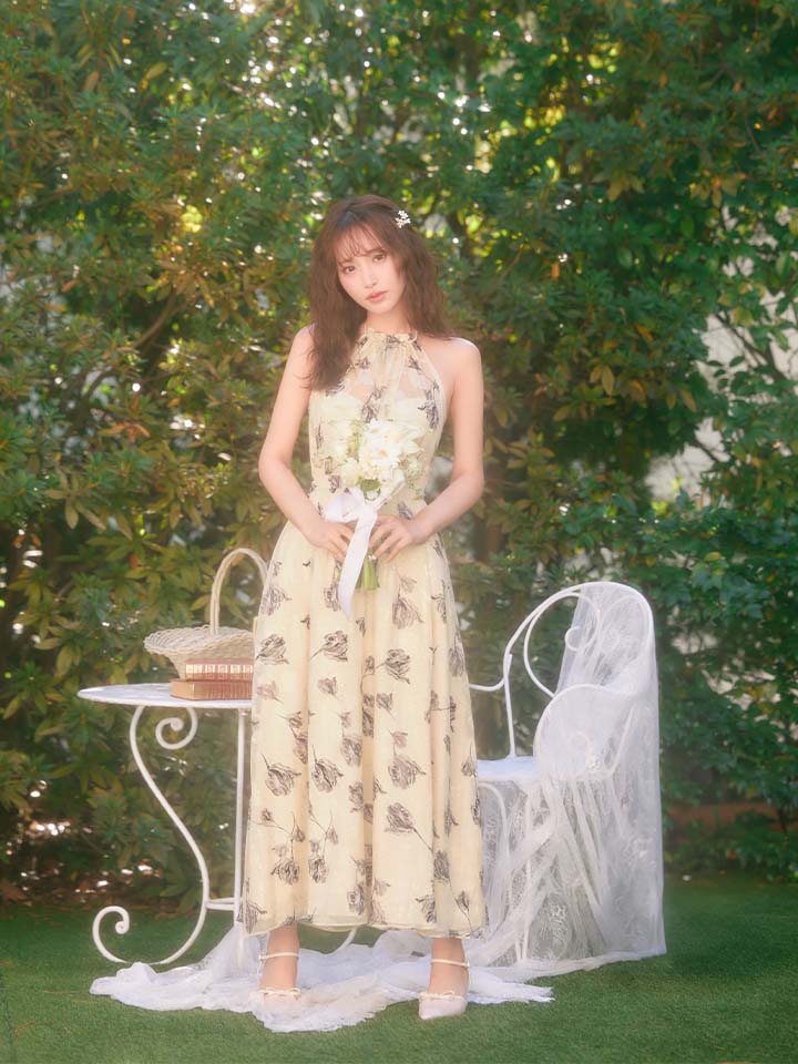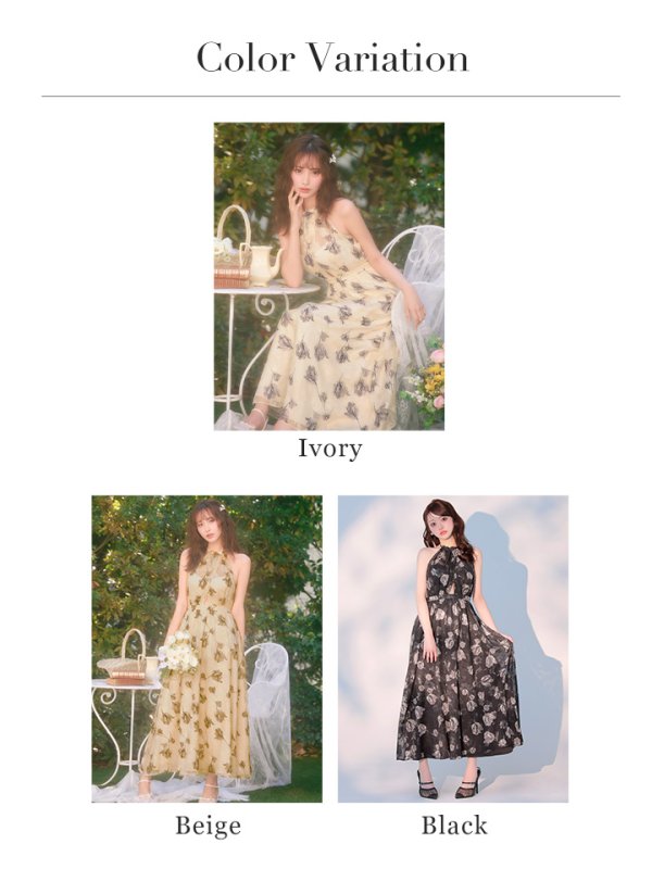 XS-Lサイズあり【DEA./ディア】フラワージャガード/ シフォン/ ホルターネック/ フレア/ ワンピース/ ミモレ丈/ ミディアムドレス/ キャバドレス long[OF08] [DE4642-BE-S260109]