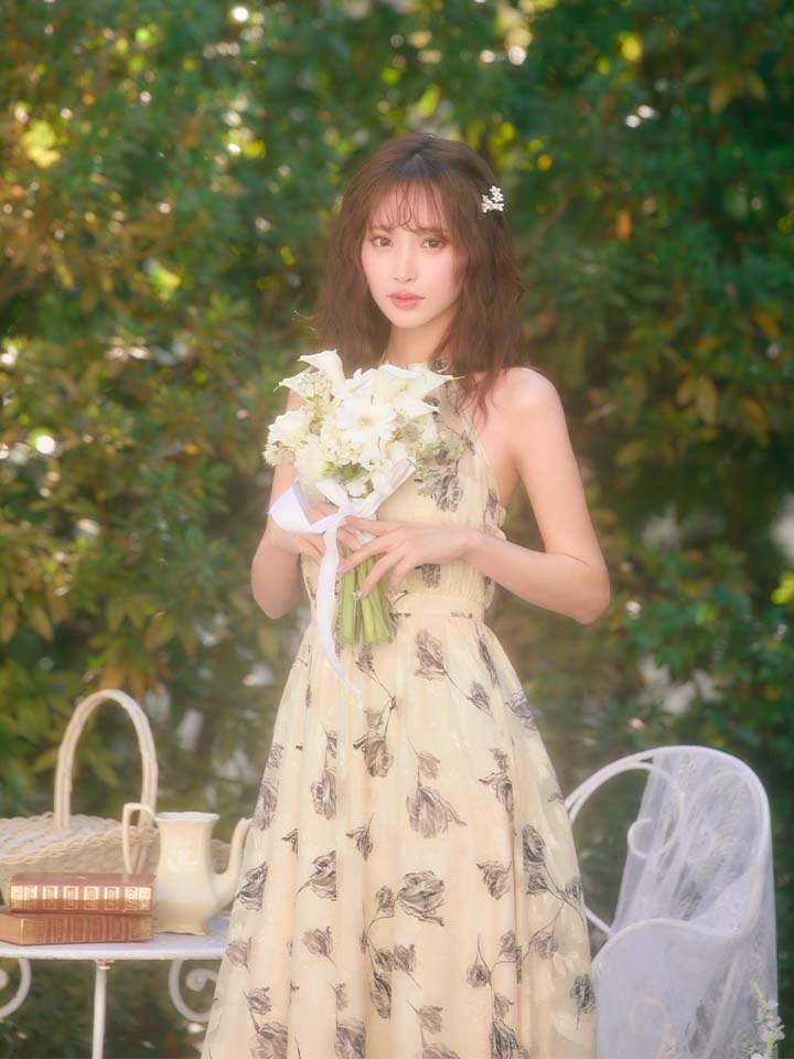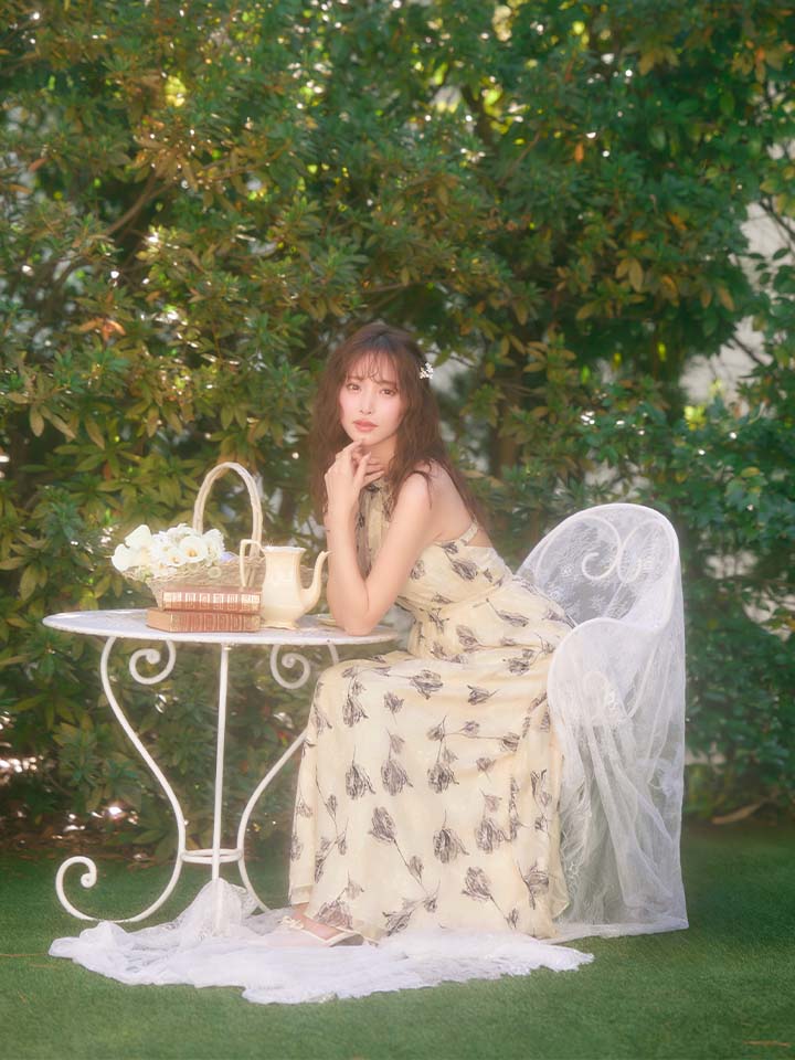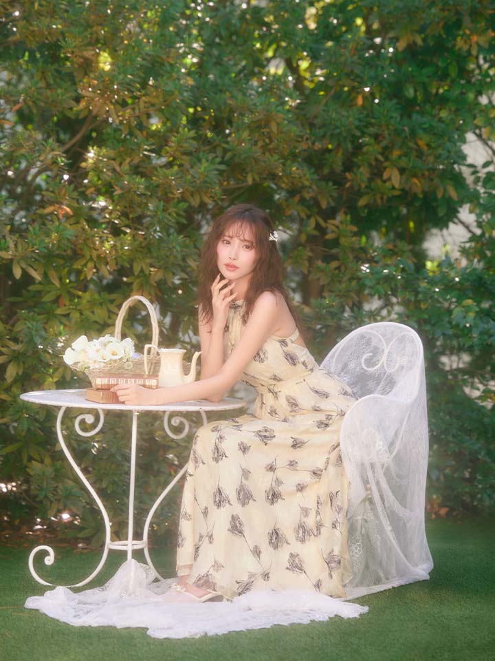背中は大胆なバックレスデザインで、洗練された大人の色気を引き立てます。