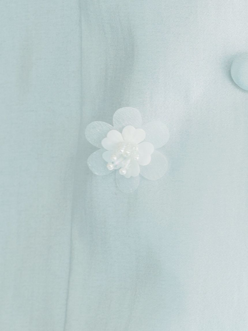 胸元のフリルと繊細な装飾が、女性らしい華やかさを引き立てます。