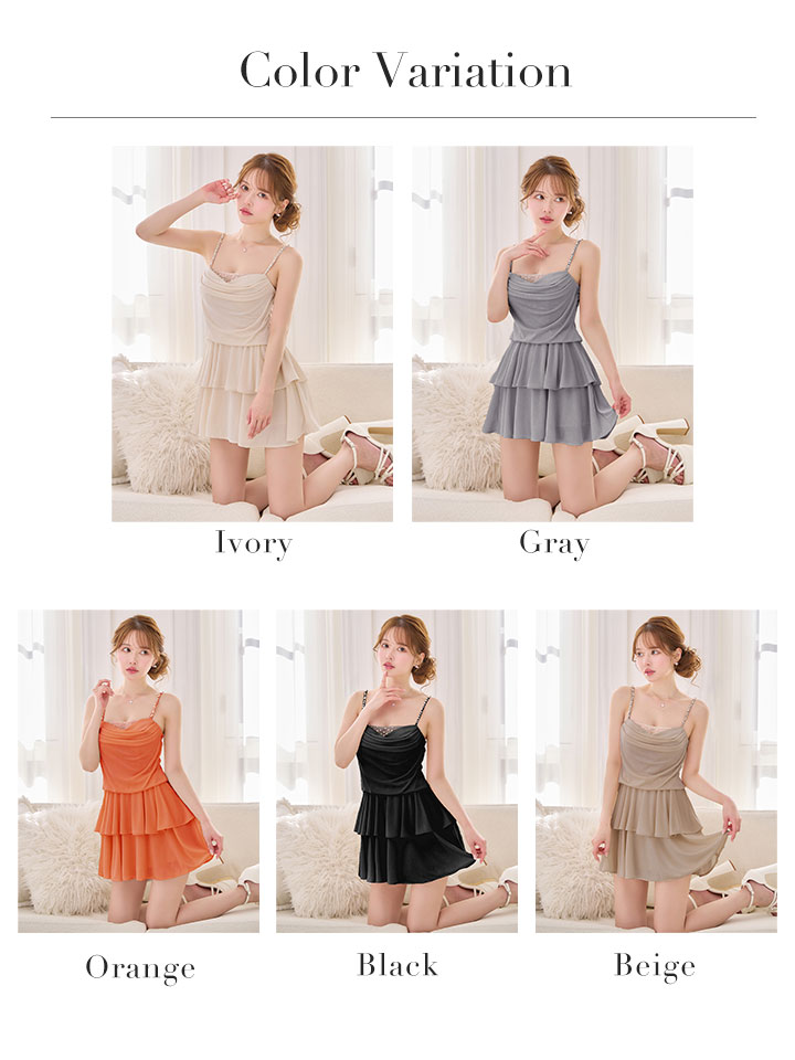 胸元は柔らかく流れるドレープデザインで、自然な立体感と上品な華やかさを演出。
