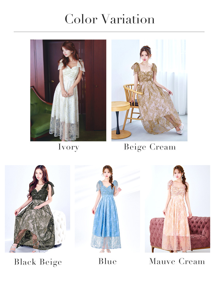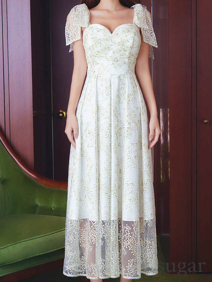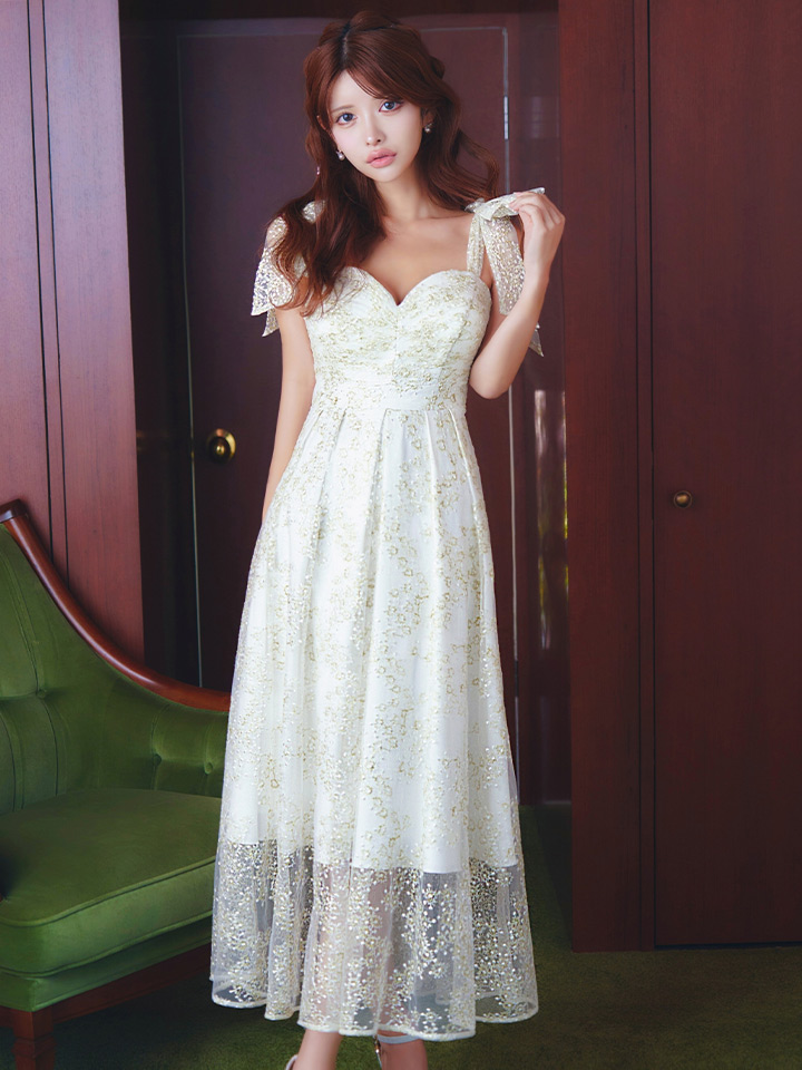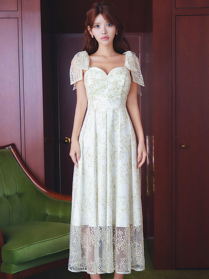 XLサイズあり【VANESSA HEART / ヴァネッサハート】【OF05】ショルダーリボン/ ギャザー/ シアー/ レース/ 刺繍/ ミモレ丈/ ワンピース/ ミディアムドレス/ キャバドレス [H60218HL-IV-S2601]