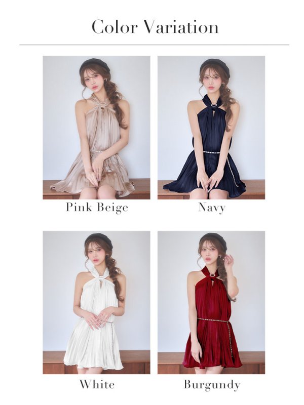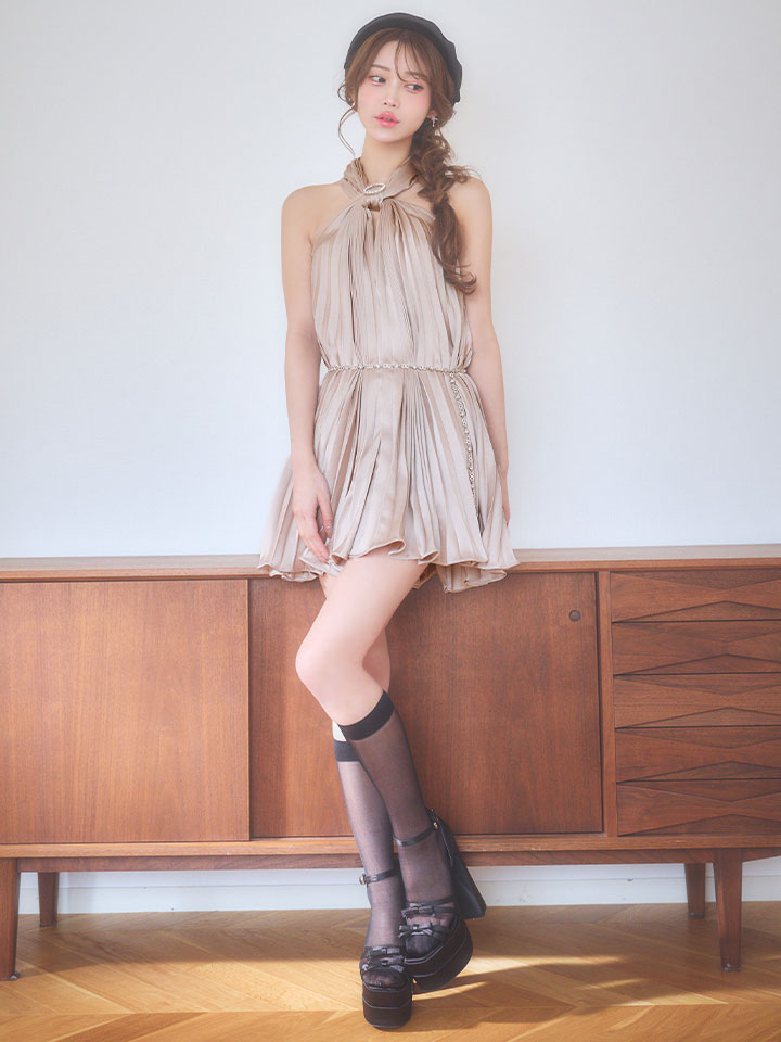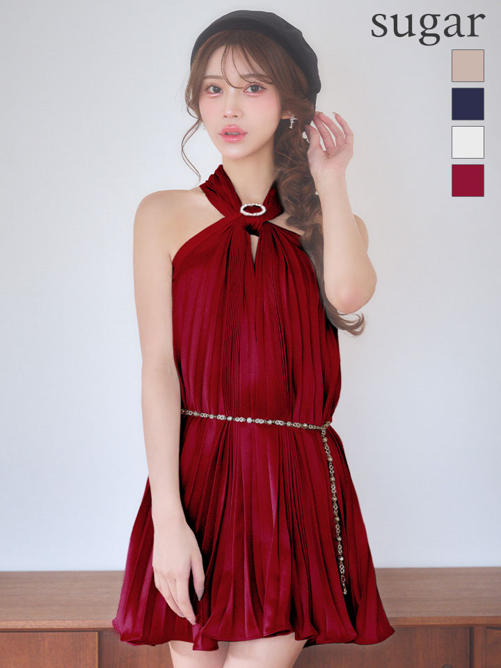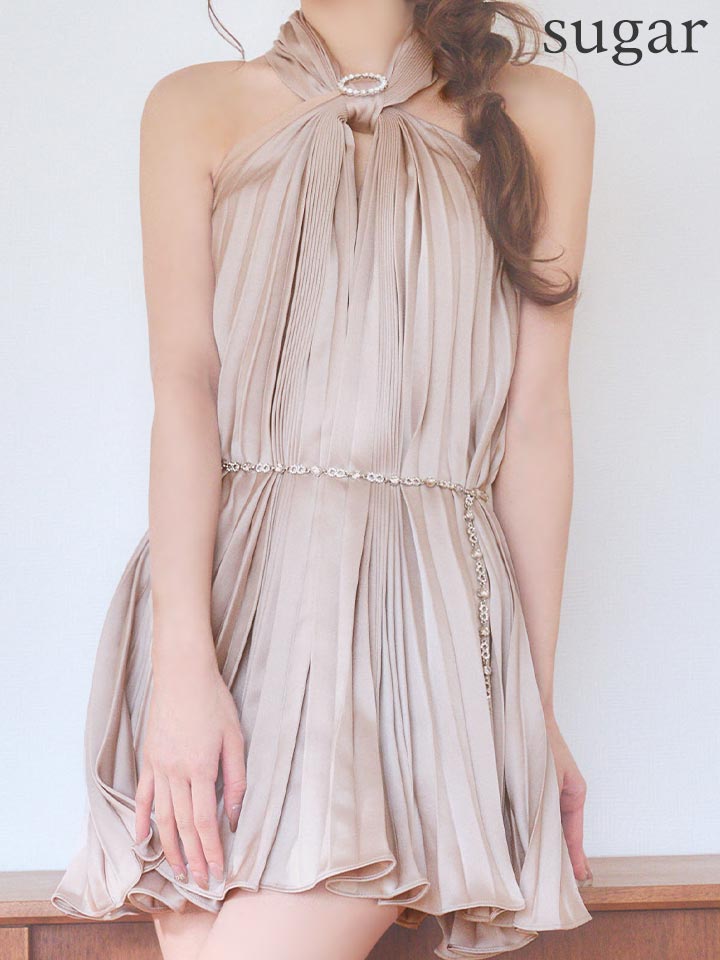ビジューで留めたホルターネックが大人可愛いミニドレス♡