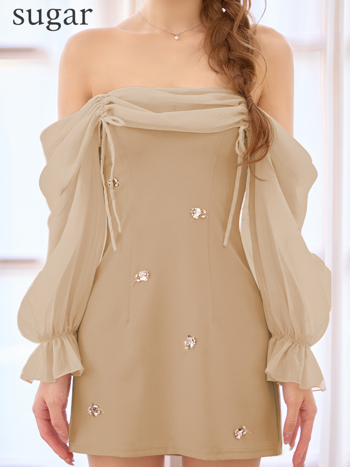 XSサイズあり【ANGEL R/エンジェルアール】オフショルダー/ ロングスリーブ/ シアー/ リボン/ フラワービジュー/ バイカラー/ フレア/ ミニドレス/ キャバドレス[OF2] [AR25873-BE-S260113]