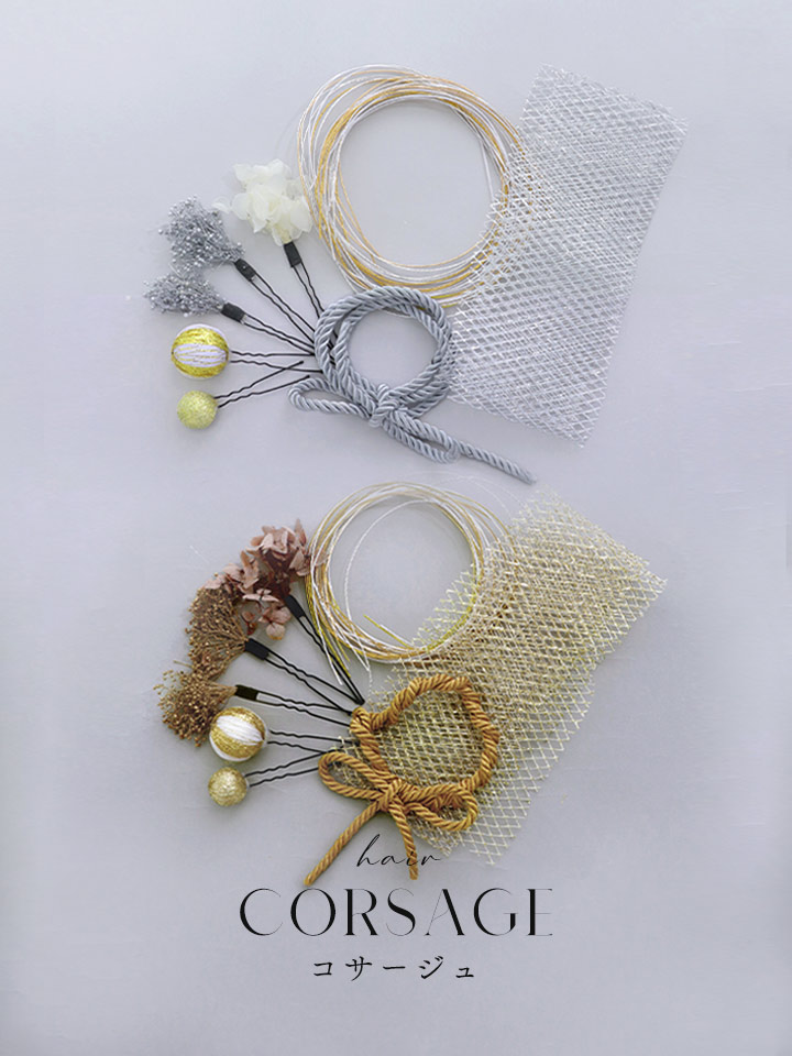 コサージュ ゴールド シルバー ホワイト 水引き リボン ドライフラワー パール