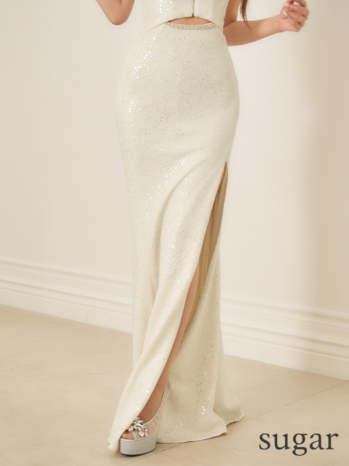 ラメニットxスパンコールが煌めく華やかなタイトロングドレス