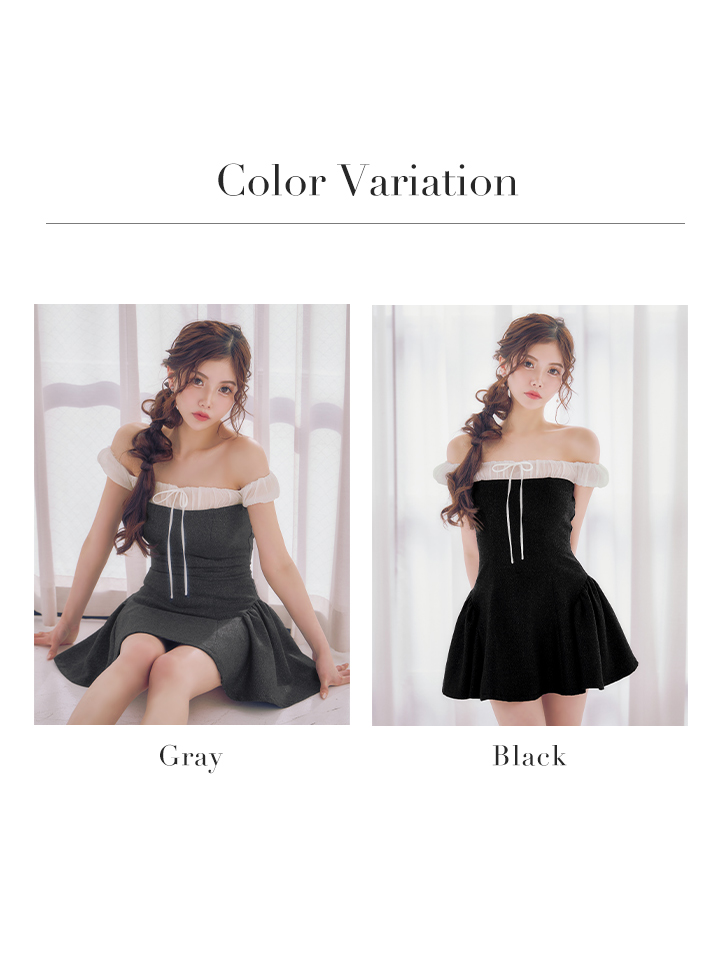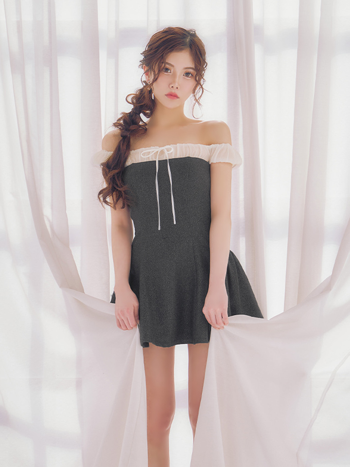 胸元のシフォン素材でフレンチガーリーなオフショルワンピースに仕上げました。
