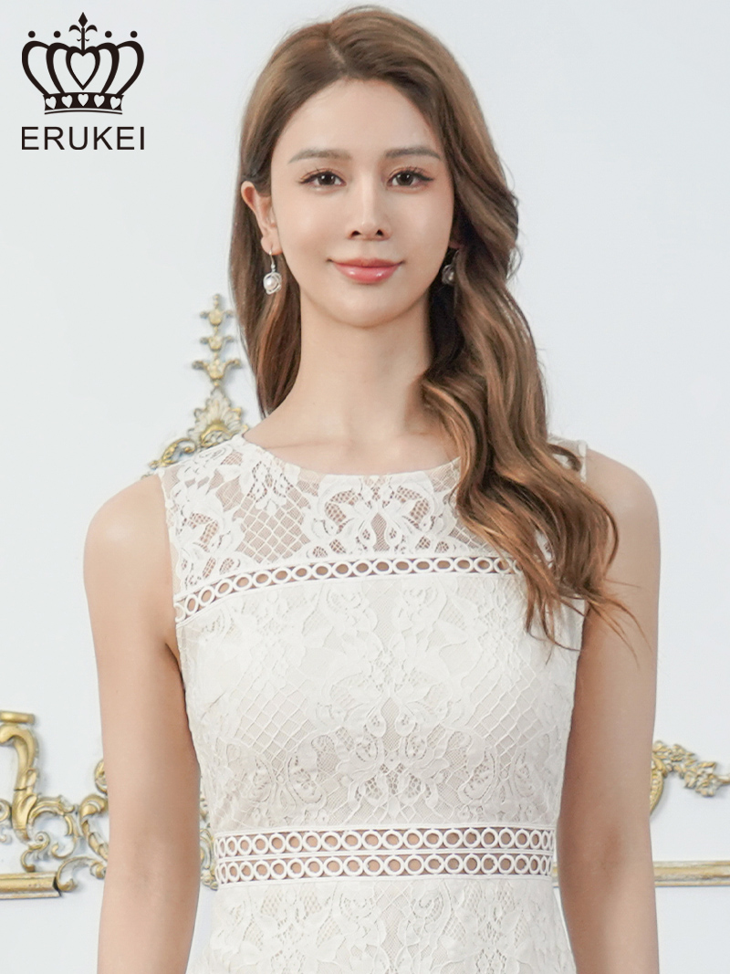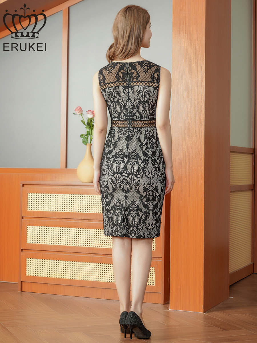 XS-Lサイズあり【SETTAN/セッタン】フラワー刺繍/ レース/ ウエストリボン/ ノースリーブ/ Vネック/ 膝丈/ タイト/ ミディアムドレス/ キャバドレス[OF2] [LKE25265-B-2601]