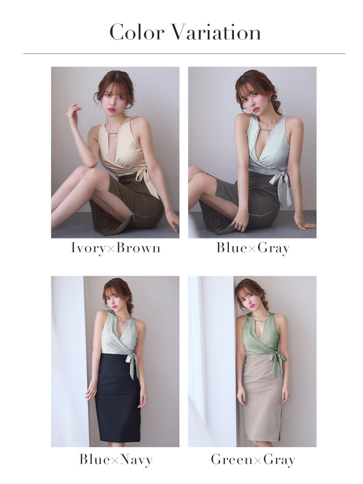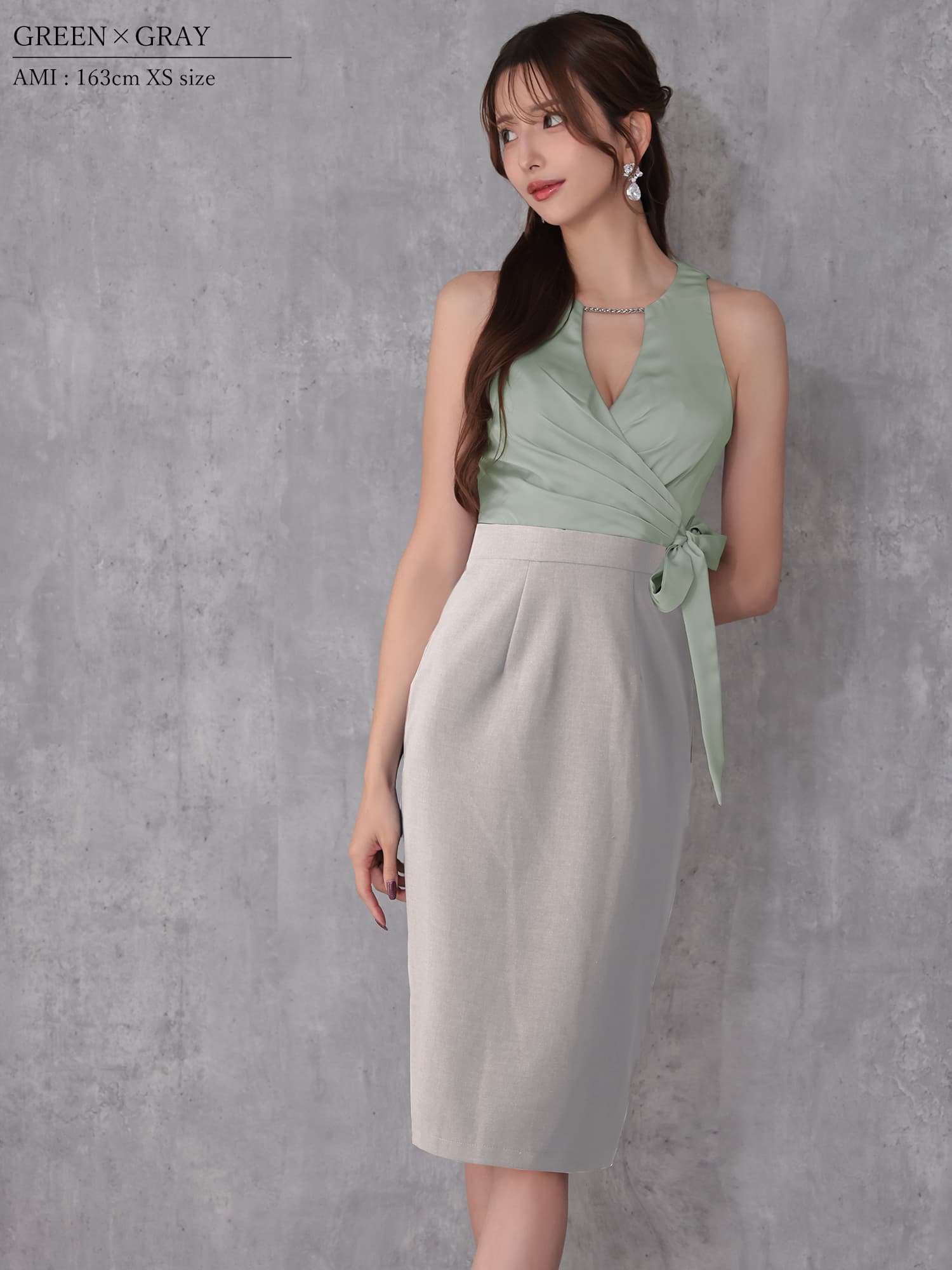 XSサイズあり【Veautt/ヴュート】【OF05】ウエストクロス/ バストタック/ リボン/ バイカラー/ チェーン/ サイドファスナー/ タイト/ ミディアムドレス/ キャバドレス [VT032601-BLxGY-S260116]