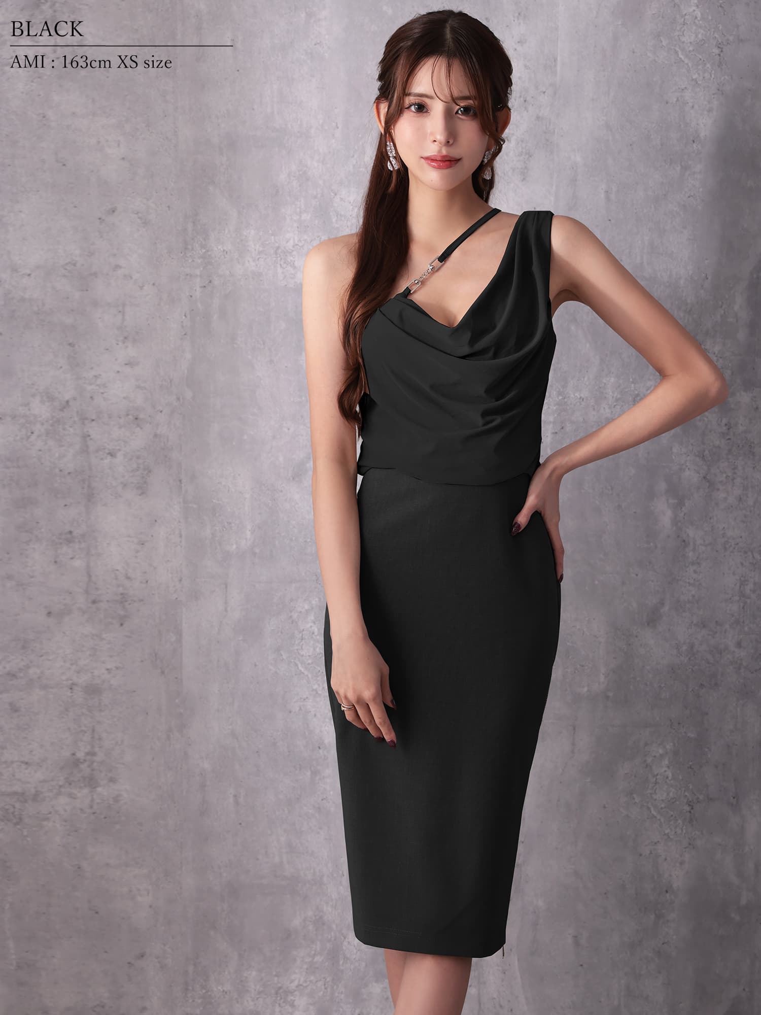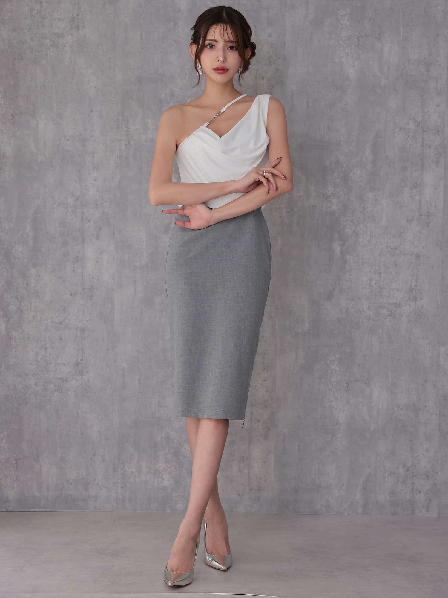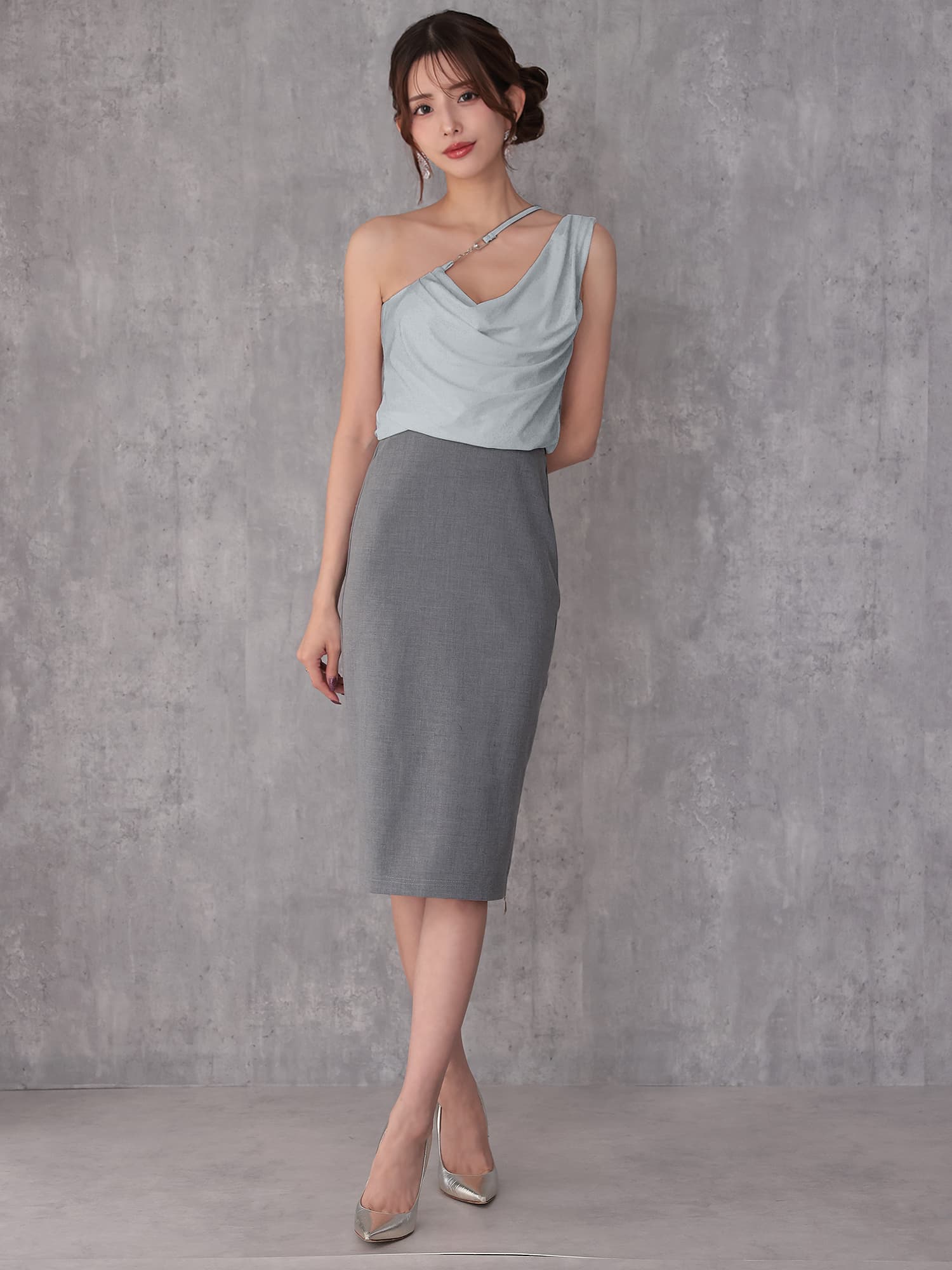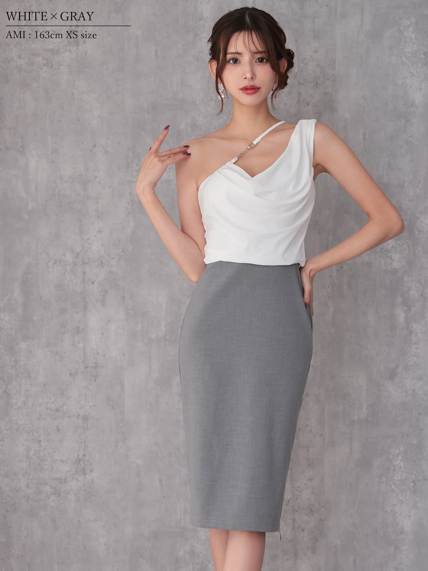 XSサイズあり【Veautt/ヴュート】ワンショルダー/ アシンメトリーデザイン/ ドレープ/ チャーム/ バイカラー/ チェーン/ サイドファスナー/ タイト/ミディアムドレス/ キャバドレス【OF05】 [VT082601-BLxGY-2601]