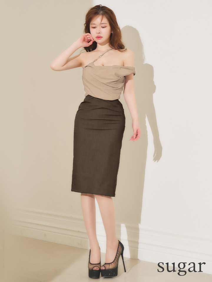 ワンショルダー仕様にさりげない金具ディテールを加え、洗練された印象に。