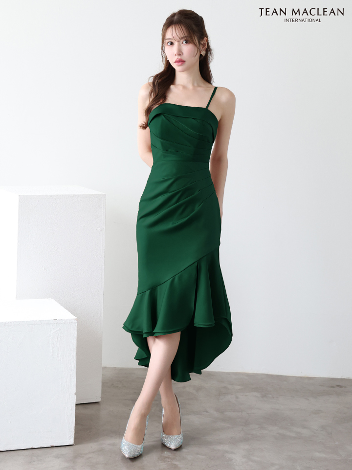 Lサイズあり【JEAN MACLEAN/ジャンマクレーン】サテン/ タック/ ワンカラー/ キャミ/ アシンメトリー/ マーメイド/ ミディアムドレス/ キャバドレス[OF2A]【一部予約商品/4月上旬発送予定】 [51941-JM-GR-2601]