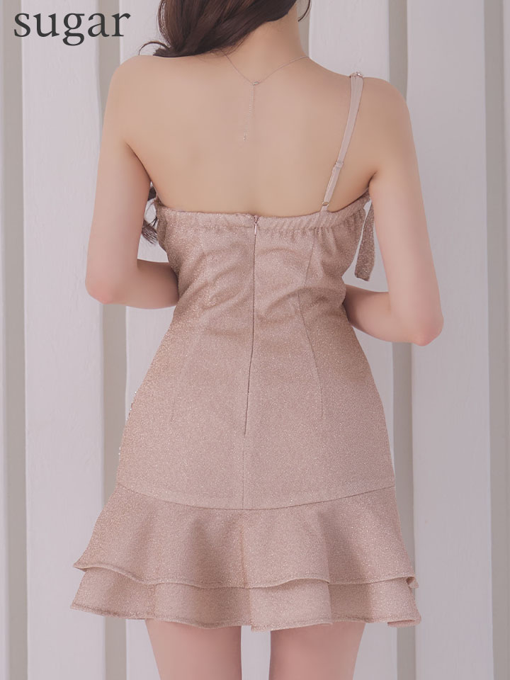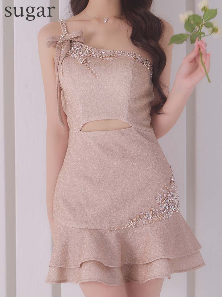 XSサイズあり【IRMA/イルマ】ラメニット/ リボン/ ワンショルダー/ ビーズ刺繍/ ティアードフリル/ フレア/ ウエストカット/ ストレッチ/ ミニドレス/ キャバドレス[OF2A] [61021-IR-BLGY-S260119]