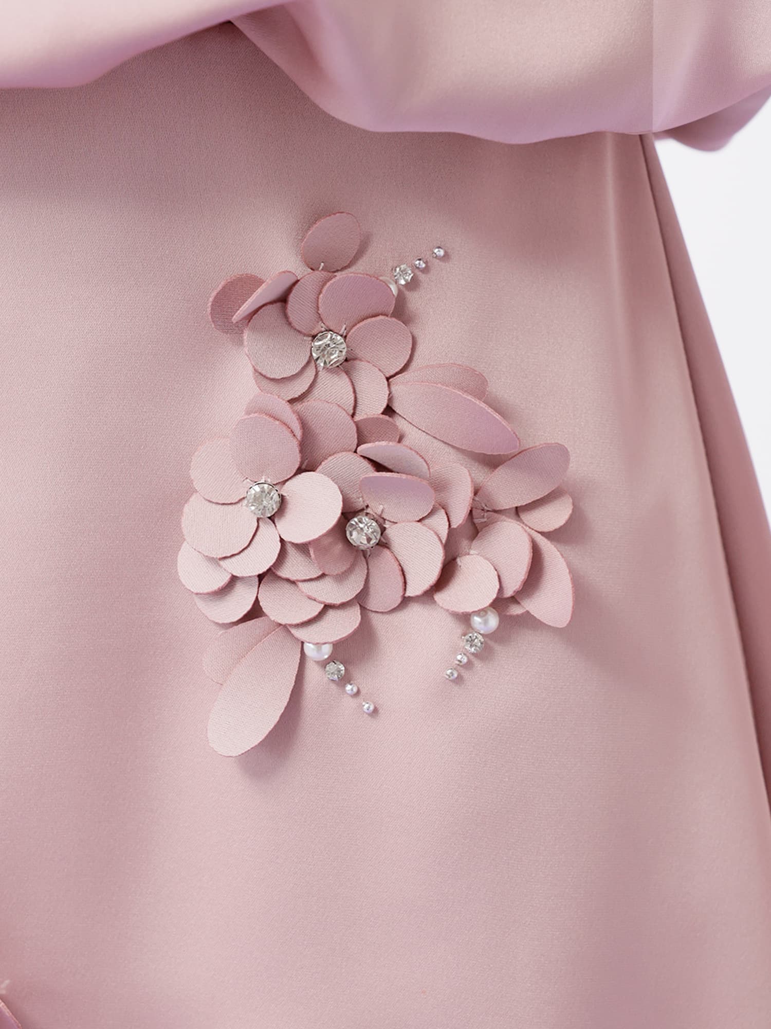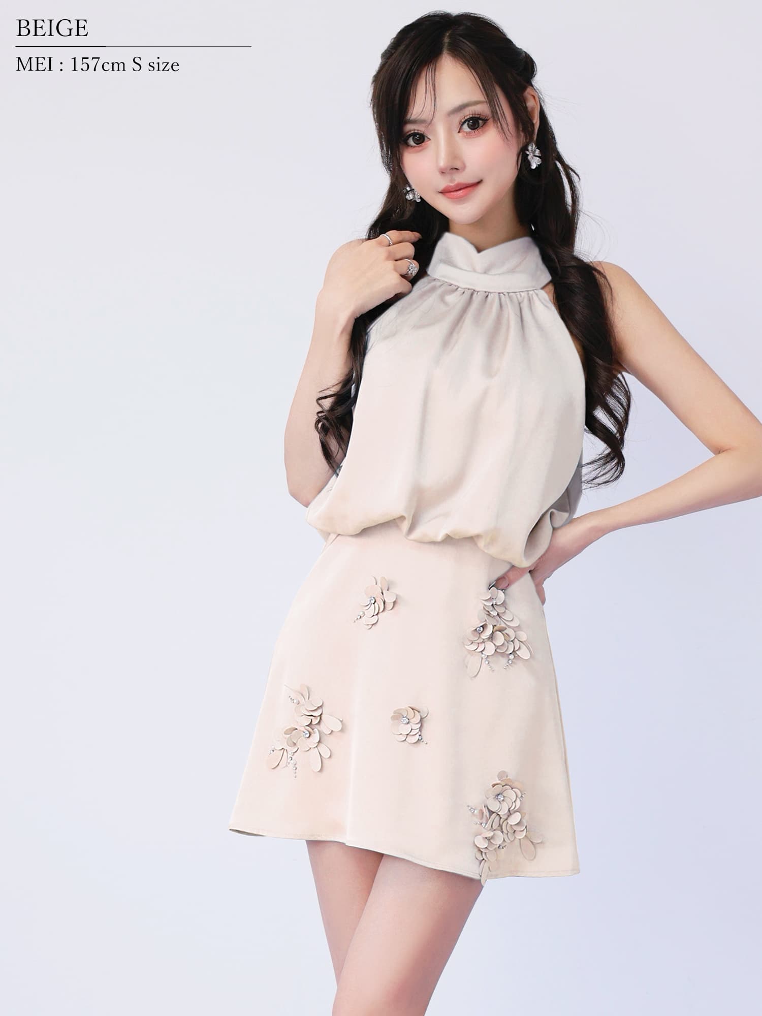 スカート全体に立体的なフラワーモチーフを配置し、華やかさとデザイン性を高めています。