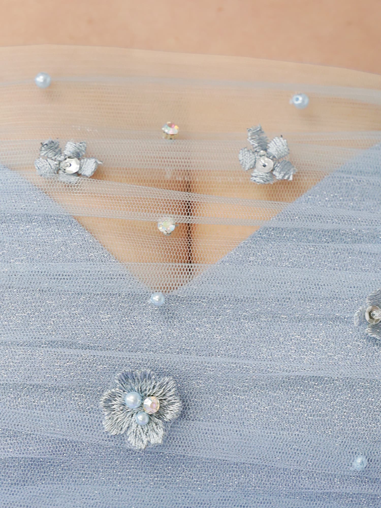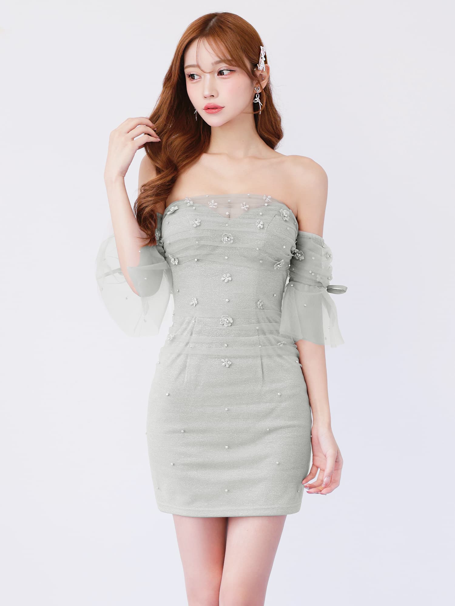 チュールを重ねたベアトップデザインに、繊細な立体フラワーとビジュー装飾を全体に施した華やかな一着。