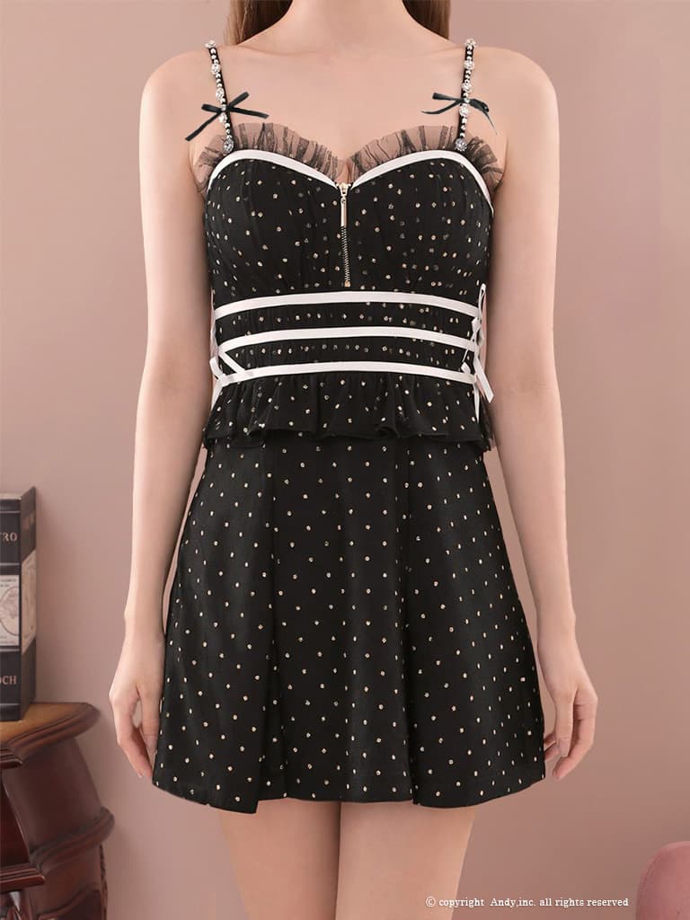 XSサイズあり【an/アン】ドット柄/ ビジューストラップ/ バストジップ/ リボン/ フリル/ キャミソール/ フレア/ ミニドレス/ キャバドレス[OF05] [AOC4055-W-2601]