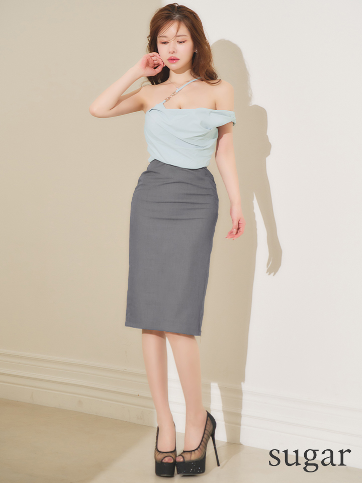 XSサイズあり【Veautt/ヴュート】ワンショルダー/ アシンメトリーデザイン/ ドレープ/ チャーム/ バイカラー/ チェーン/ サイドファスナー/ タイト/ミディアムドレス/ キャバドレス【OF05】 [VT082601-BLxGY-S260123]