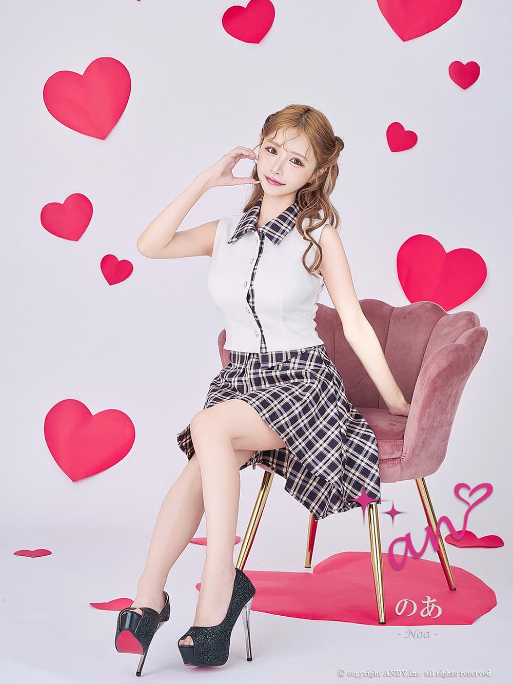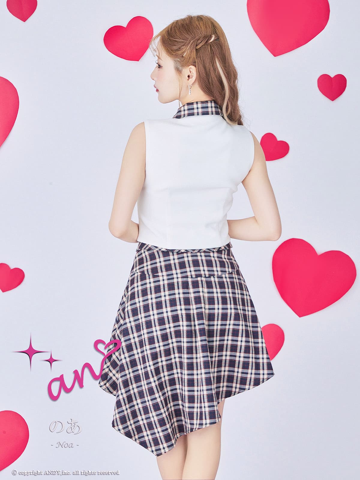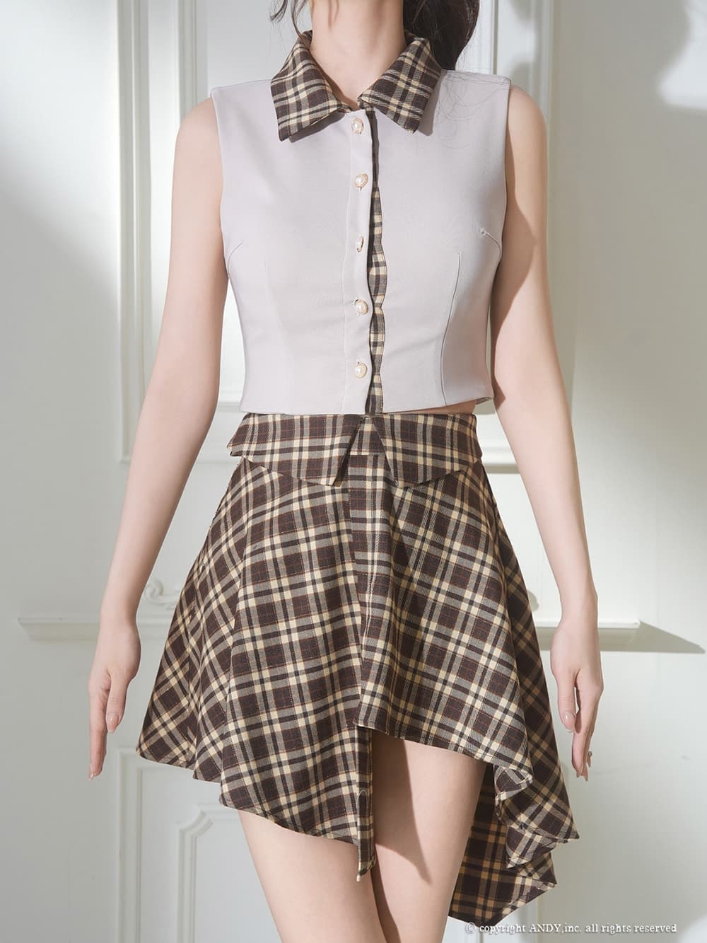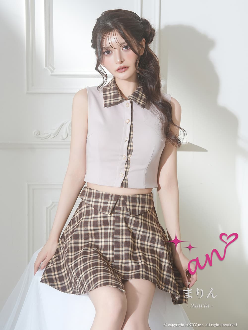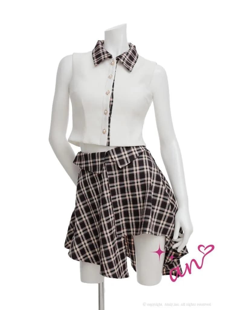 XSサイズあり【an/アン】チェック柄/ アシンメトリー/ ノースリーブ/ パールボタン/ シャツ/ 襟付き/ セットアップ/ フレア/ ミニドレス/ キャバドレス[OF05] [AOC4056-WxNV-2601]