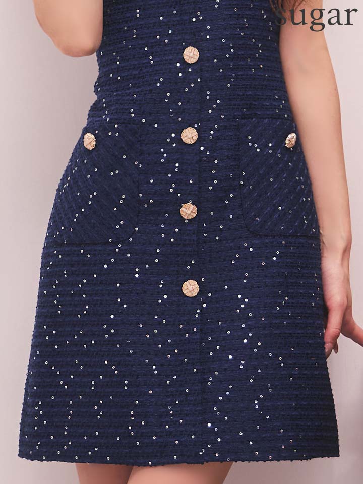 XS-Lサイズあり【GINZA COUTURE/銀座クチュール】ツイード/ スパンコール/ ボタン/ ノースリーブ/ Aライン/ 膝丈/ ワンピース/ ミディアムドレス/ キャバドレス[OF2] [LKC25082-NV-S260127]
